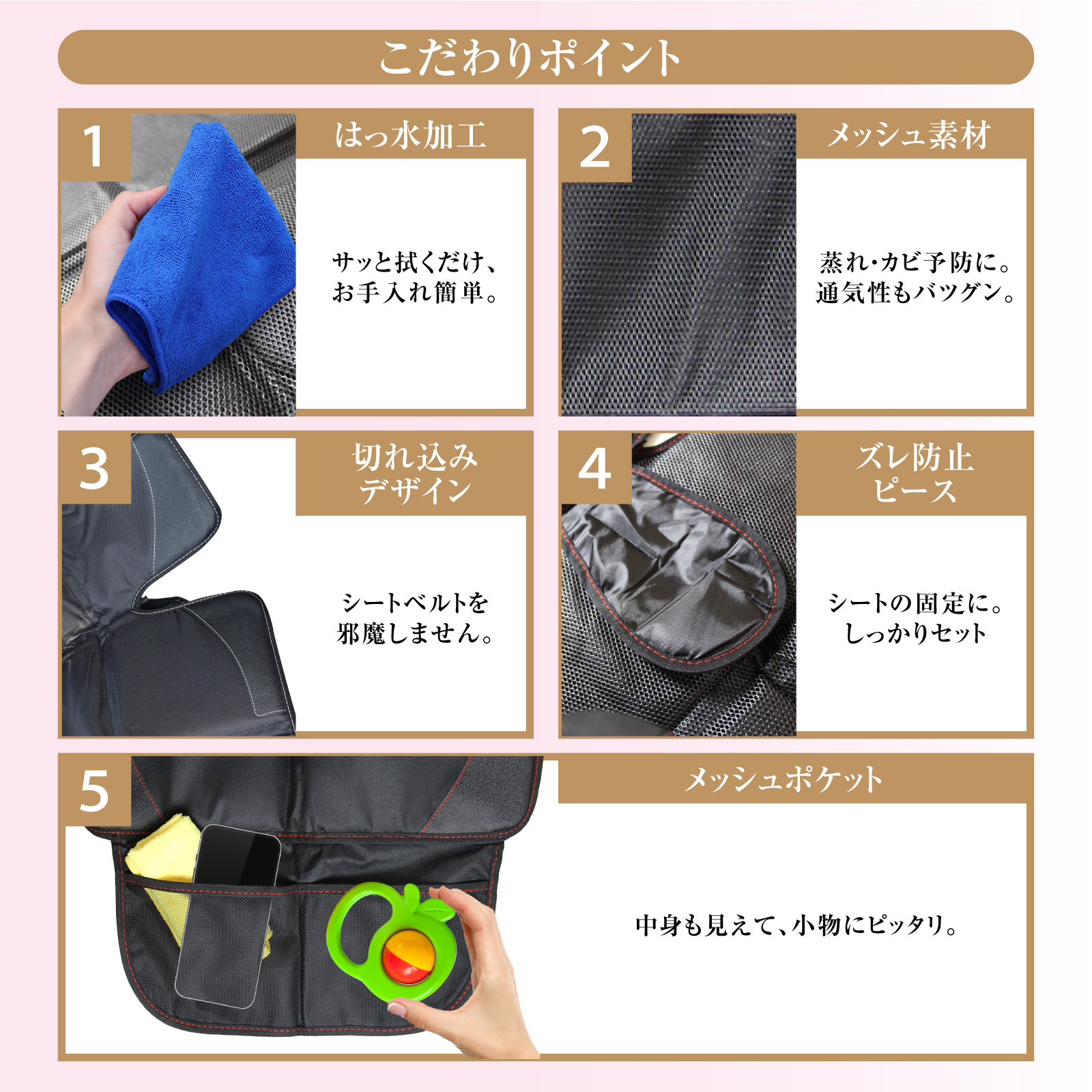 | 商品特徴 | シートのお悩み、まとめて解決。 羽根が付いてて、サイドもガード。 カラーも選べる、チャイルドシート保護マット(羽根付き)。 ・POINT.1 「しっかり守る。」 ・600Dオックスフォードクロスを採用。 耐摩耗性に富んだ厚手素材で、大事なシートをしっかりカバー。 ヘコミを防止、キズ防止。チャイルドシート保護プロテクター。 ・POINT.2 「羽根付きデザイン。」 ・サイドも保護して、汚さない。 羽根付きマットで、シートをカバー。 シートサイドの食べこぼしはもちろん、乗り降り時のクツ跡よごれも防ぎます。 ・POINT.3 「取付簡単。」 ・設置はたったの3ステップ。 工具不要で、届いたその日に設置可能。 おじいさま・おばあさまの車への移動も簡単・便利です。 ---------------------------------------------------------------------------------- (取付け方法) 1.ずれ防止ピースをシートの隙間に差し込みます。 2.バックルを取付け、長さを調節します。 3.形を整え、ズレやすき間がなければ完了です。 ---------------------------------------------------------------------------------- ・POINT.4 「グラつき防止。」 ・防滑素材で、滑らない。 厚手の生地でグラつき抑え、防滑加工が滑りも抑制。 防滑マットでドライブ快適。チャイルドシート保護カバー。 ・POINT.5 「こだわり設計。」 ・使うひとのことを考えた、こだわりのデザイン。 ---------------------------------------------------------------------------------- (こだわりポイント) 1.はっ水加工:サッと拭くだけ、お手入れ簡単。 2.メッシュ素材:ムレ・カビ予防。通気性も抜群。 3.切れ込みデザイン:シートベルトを邪魔しません。 4.ズレ防止ピース:シートを固定。しっかり設置。 5.メッシュポケット:中身も見えて、小物に便利。 ---------------------------------------------------------------------------------- [国際標準規格:ISOFIXにも対応] ・チャイルドシートと車の直接固定方法(ISOFIX)にも対応。 固定箇所の邪魔になりません ・POINT.6 「選べるカラー。」 ・ステッチカラーの違う3色をご用意。 車内に合せて、気分に合せて、お好きなタイプをお選び下さい。 ---------------------------------------------------- (カラーバリエーション) ・ブラック(レッドステッチ) ・ブラック(ブラックステッチ) ・ブラック(グレーステッチ) ---------------------------------------------------- 凹みを防止、キズ防止。 シートを守って、ドライブ快適。 サイドもガード、羽根付き・チャイルドシートマットカバー。 (このような商品をお探しのかたに) 羽根付き チャイルドシート 保護マット カバー 滑り止め サイドをカバー 保護 シート 快適 マットカバー カーシート チャイルドシートマット シートカバー 子ども 取付簡単 ズレ防止 シートプロテクター isofix 対応 防水 マット ジュニアシート シートカバー シート マット 保護シート カーシート チャイルドシートマット クッション シートカバー 車用品 カー用品 赤ちゃん キッズ 座席カバー 選べる3色 レッド ブラック グレー ステッチ |