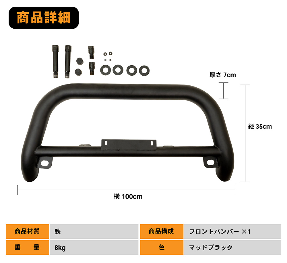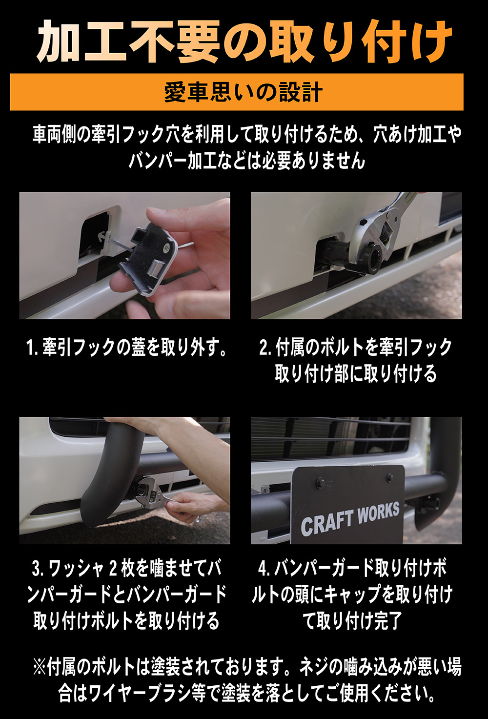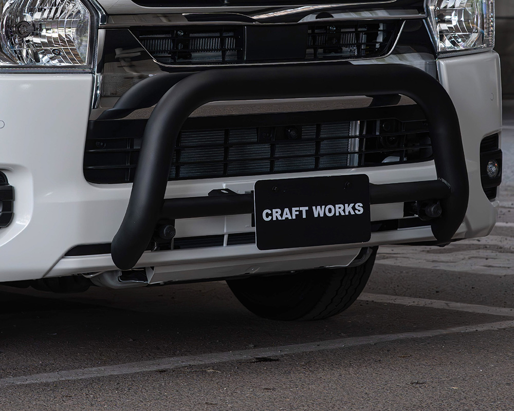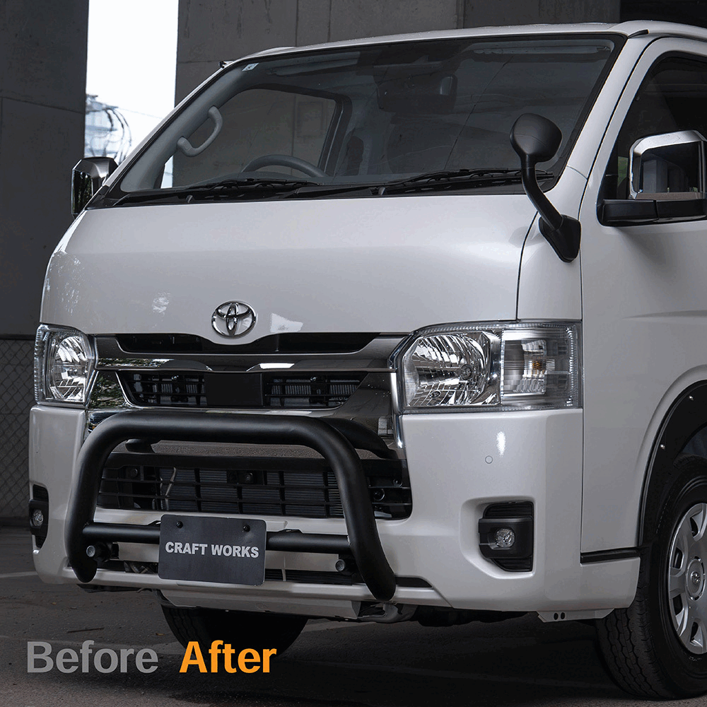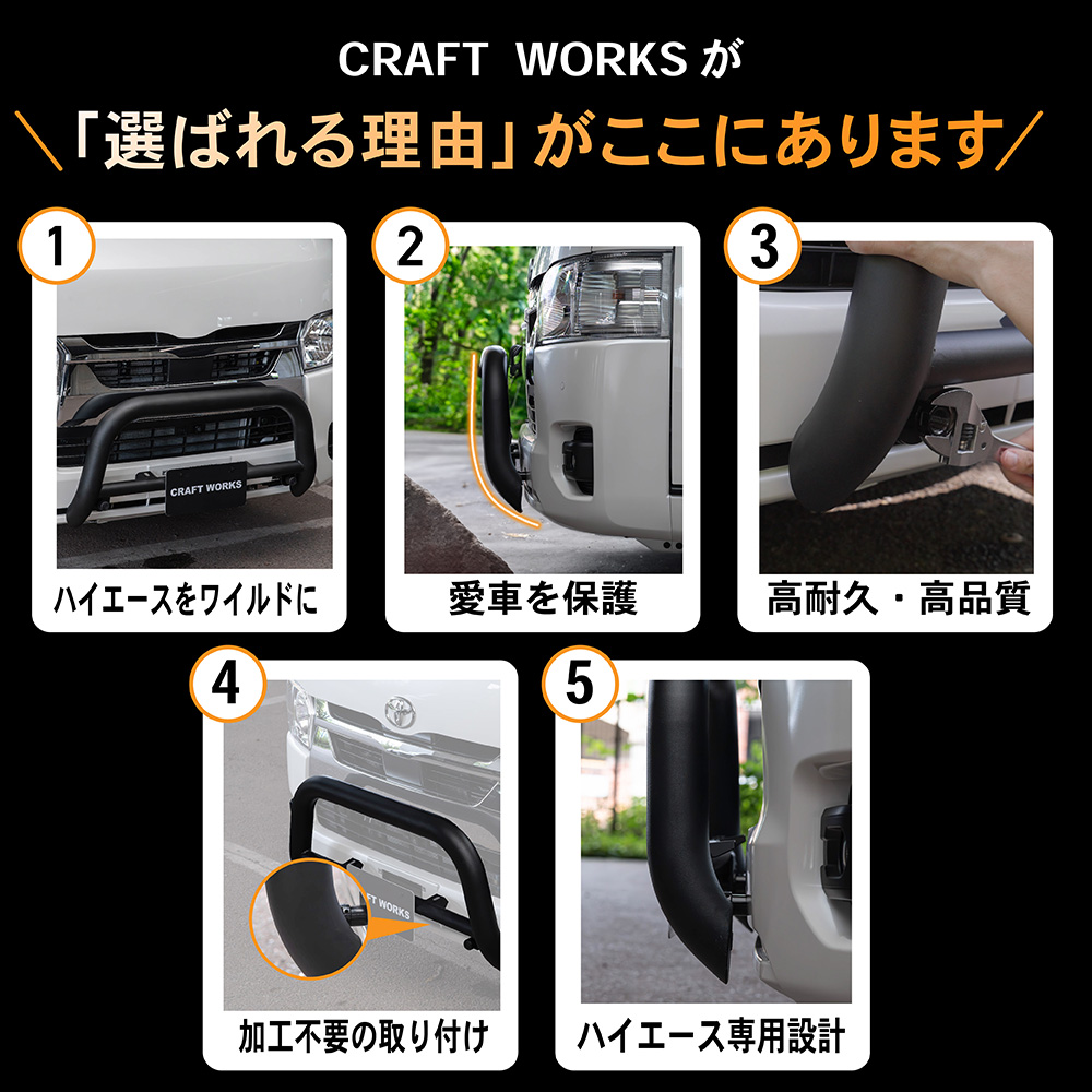 | 特徴 | 劇的に変わるフロントビュー ・POINT.1 「ハイエースをワイルドに」 アウトドア仕様やシティオフロードなどさまざまなジャンルに合うデザイン 純正より強く・かっこいい装飾で、周りと差をつける ・POINT.2「フロントバンパーを保護」 傷つきやすいフロントアンダーを守る バンパーは溶接一体型のため、パーツが外れる心配もありません。 ・POINT.3「 ・ 」 バンパーは耐久性のある金属素材で作られております。 ブラックパウダーコーティングにより耐食性が向上 ・POINT.4「加工不要の取り付け」 車両側の牽引フック穴を利用して取り付けるため 穴あけ加工やバンパー加工などは必要ありません ・POINT.5「ハイエース専用設計」 車体とバンパーの隙間、見た目まで開発担当が考案 ピッタリの装着感をご体験ください。 |