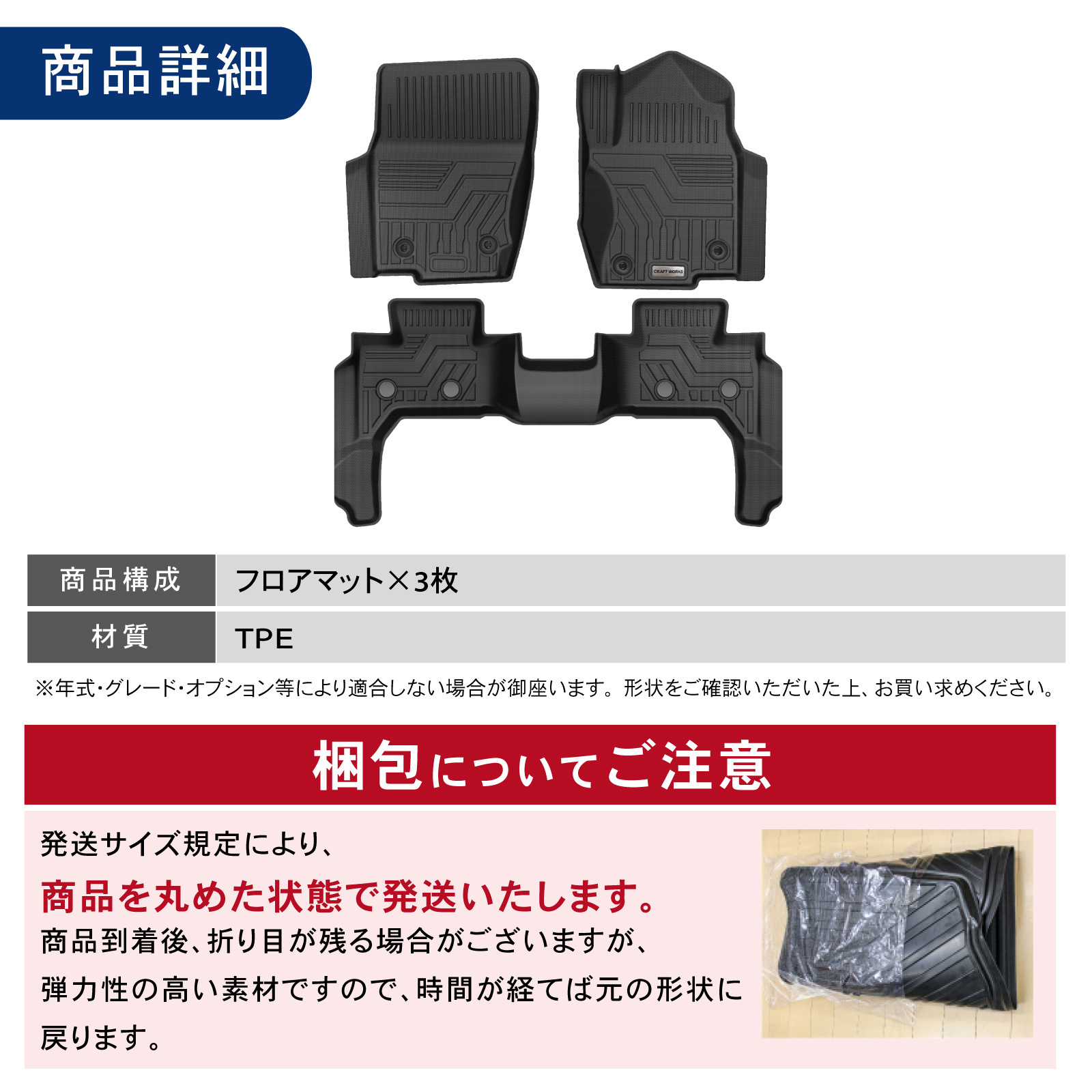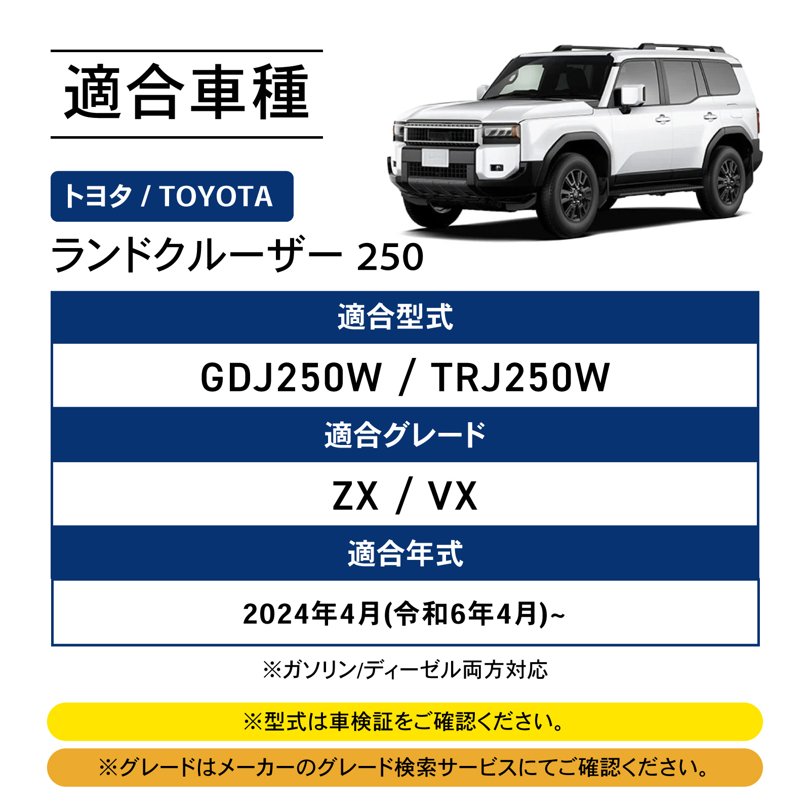 | 商品詳細 | [適合車種 ] TOYOTA/トヨタ LAND CRUISER 250/ランドクルーザー250 [適合型式 ] GDJ250 [適合グレード ] GX [商品素材 ] TPE [商品構成 ] フロアマット 3枚 [注意事項 ] 2024年4月(令和6年4月)〜 注意)5人乗り専用マットです。 |