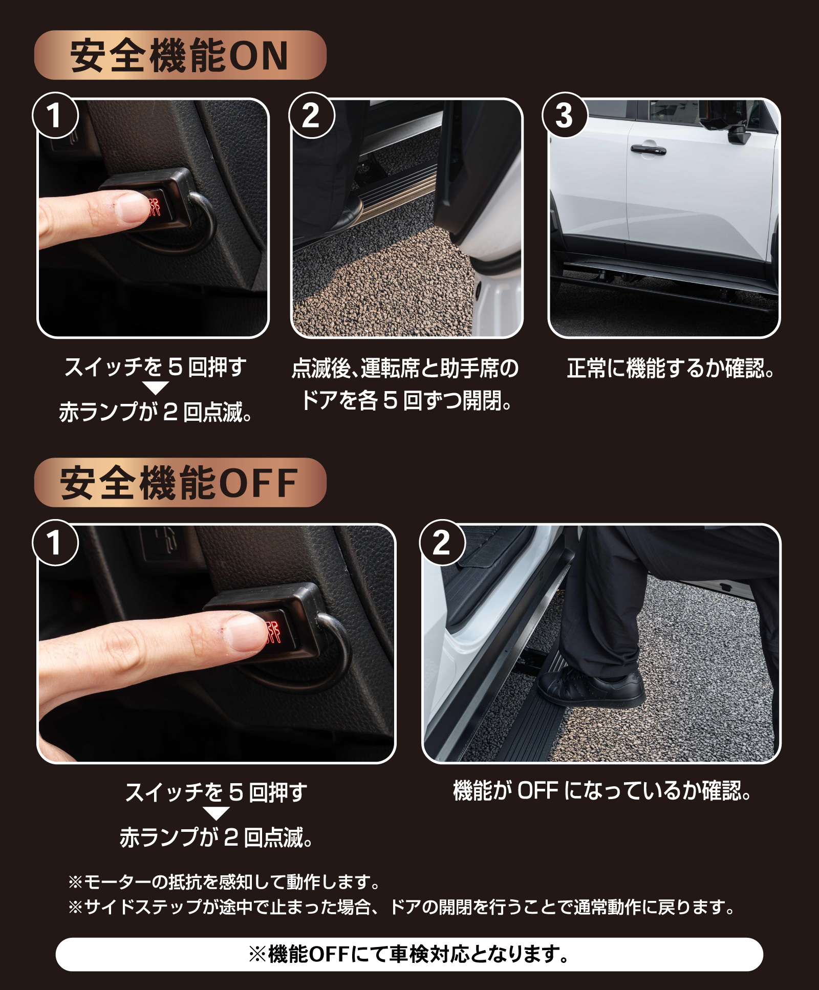 | 商品詳細 | [適合車種] TOYOTA/トヨタ LAND CRUISER 250/ランドクルーザー250 [適合型式] GDJ250(GDJ250W) TRJ250(TRJ250W) [適合グレード] ZX VX [適合年式] 2024年4月(令和6年4月)〜 [製品詳細] ・商品名:電動サイドステップ ・素材:アルミ合金 ・重量:30kg ・耐荷重 300kg ・製品の地面からの高さ:30cm ・開き時の出幅:16cm ・収納時の車高高さ:32cm 注意)安全機能をONにしている場合、ステップの汚れなどで誤作動を起こす可能性があります。ステップは常に汚れのないように清掃をお願いいたします。 注意)サイズは、計測方法によって若干異なる場合がございます。 注意)誤った配線や使用方法による車両の破損、故障、事故が発生しても当店は一切責任を負いません。 注意)装着、使用に関しては正しい知識、技術が必要となります。 |