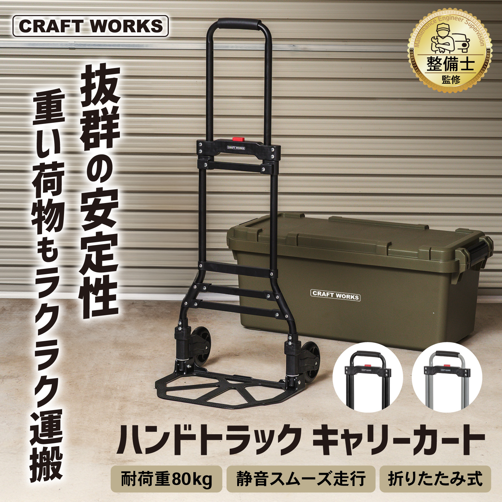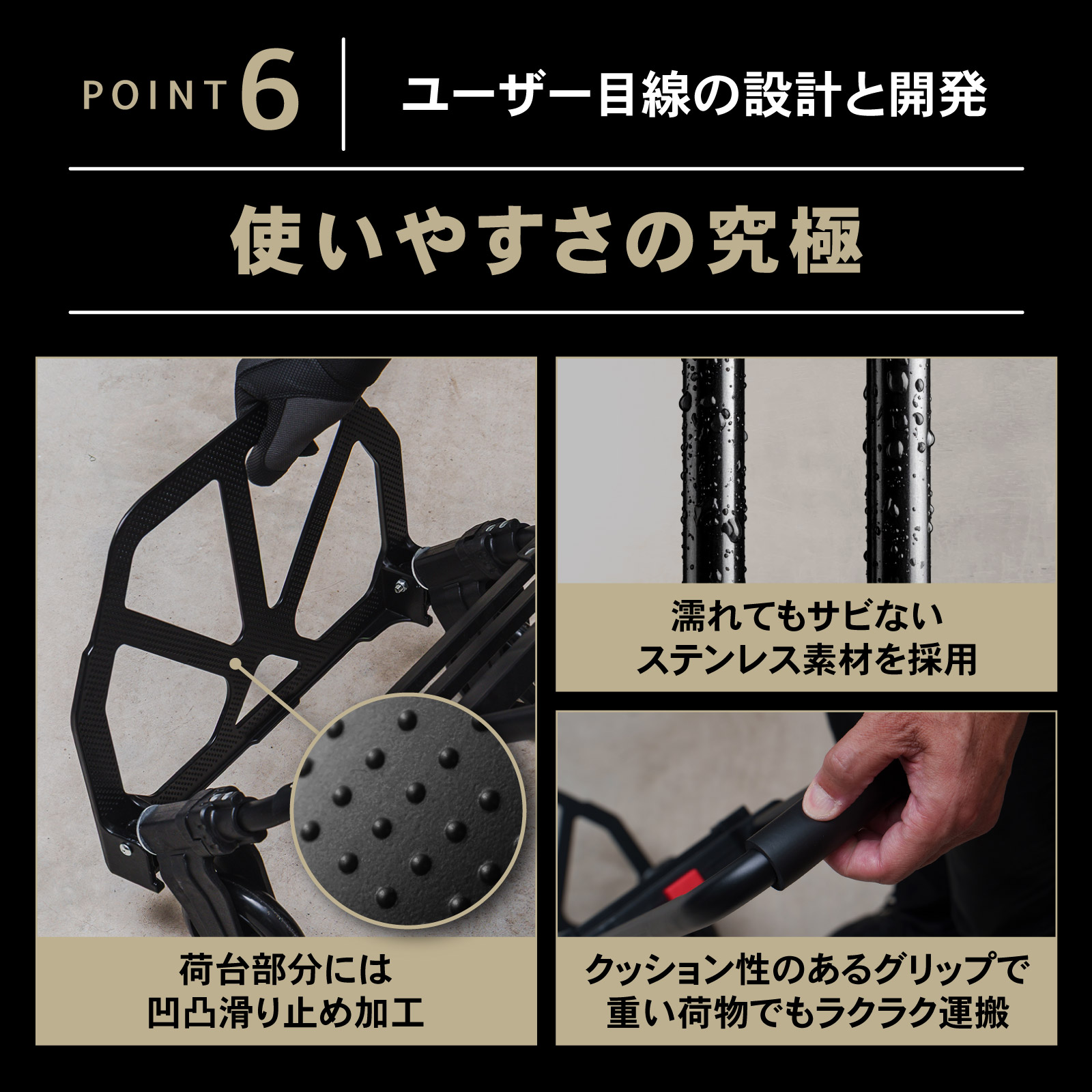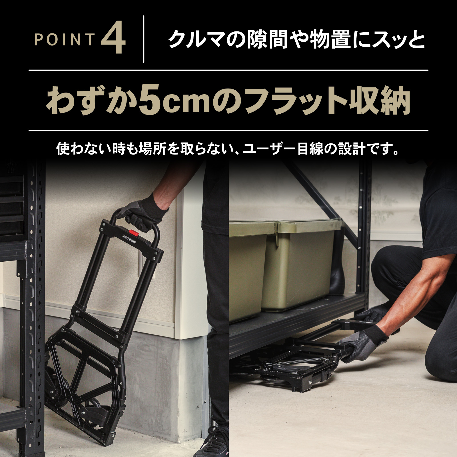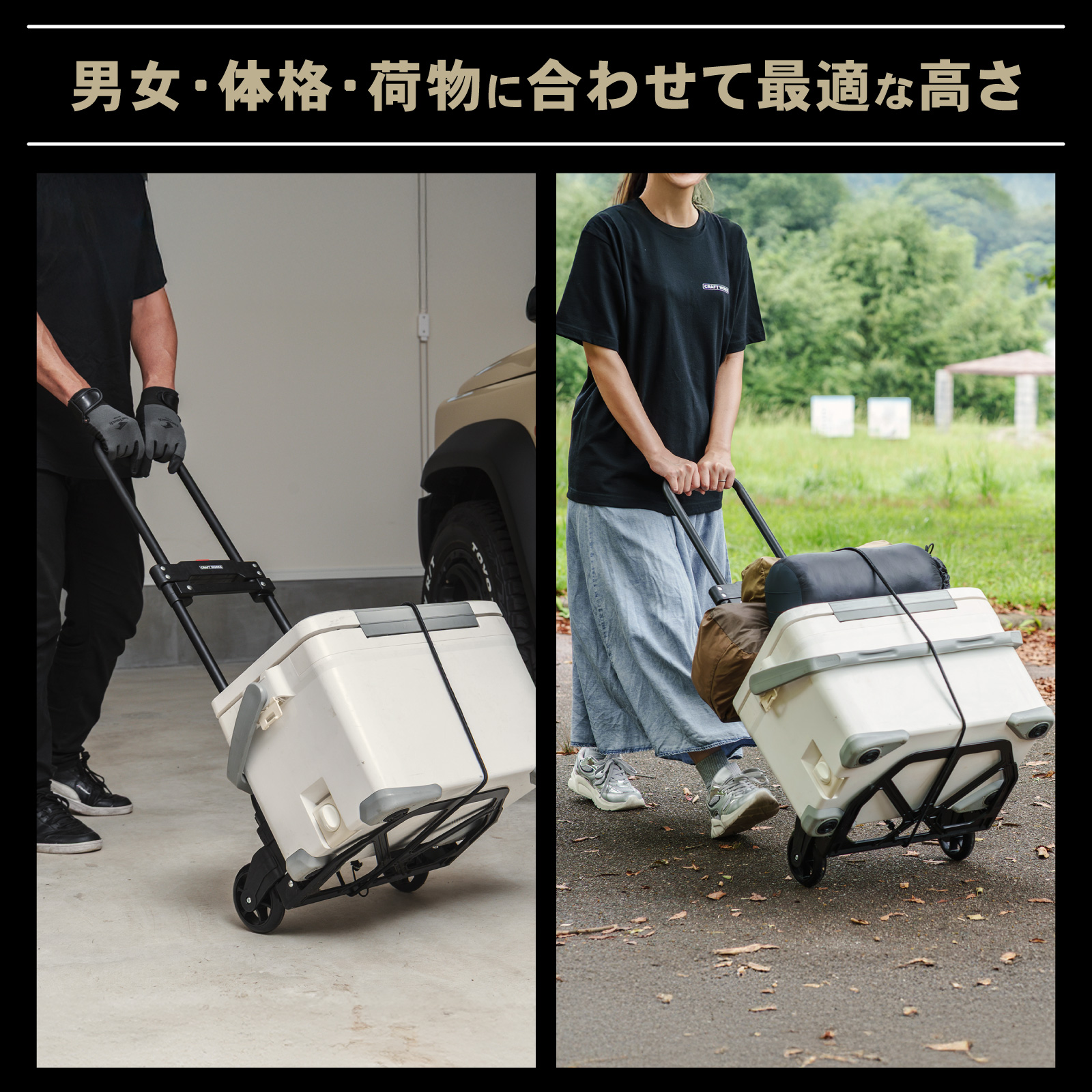 | 商品紹介 | POINT.1 「耐荷重最大80kg」 耐荷重を適切に設定することで、強度を保ちながら無駄を排除。 最適な運搬力を提供します。 POINT.2 「フックロープで荷物の落下を防止」 伸縮性のあるロープで荷物の大きさ問わずしっかり固定が可能です。 POINT.3 「静かで安定した走行」 タイヤには衝撃を吸収するTPR素材を採用。 硬さと柔軟性のバランスで、快適な運搬を実現します。 POINT.4 「わずか5cmのフラット収納」 使わない時も場所を取らない、ユーザー目線の設計です。 POINT.5 「高さ調整 運びやすい」 進化した使いやすさ 手に取れば実感 男女・体格・荷物に合わせて最適な高さ POINT.6 「使いやすさの究極」 ・荷台部分には凹凸滑り止め加工・濡れてもサビないのステンレス素材を採用・クッション性のあるグリップで重い荷物でもラクラク運搬 POINT.7 「どこでもラクラク運べる」 ・軽量設計で女性でも無理なく持ち運べます。 |