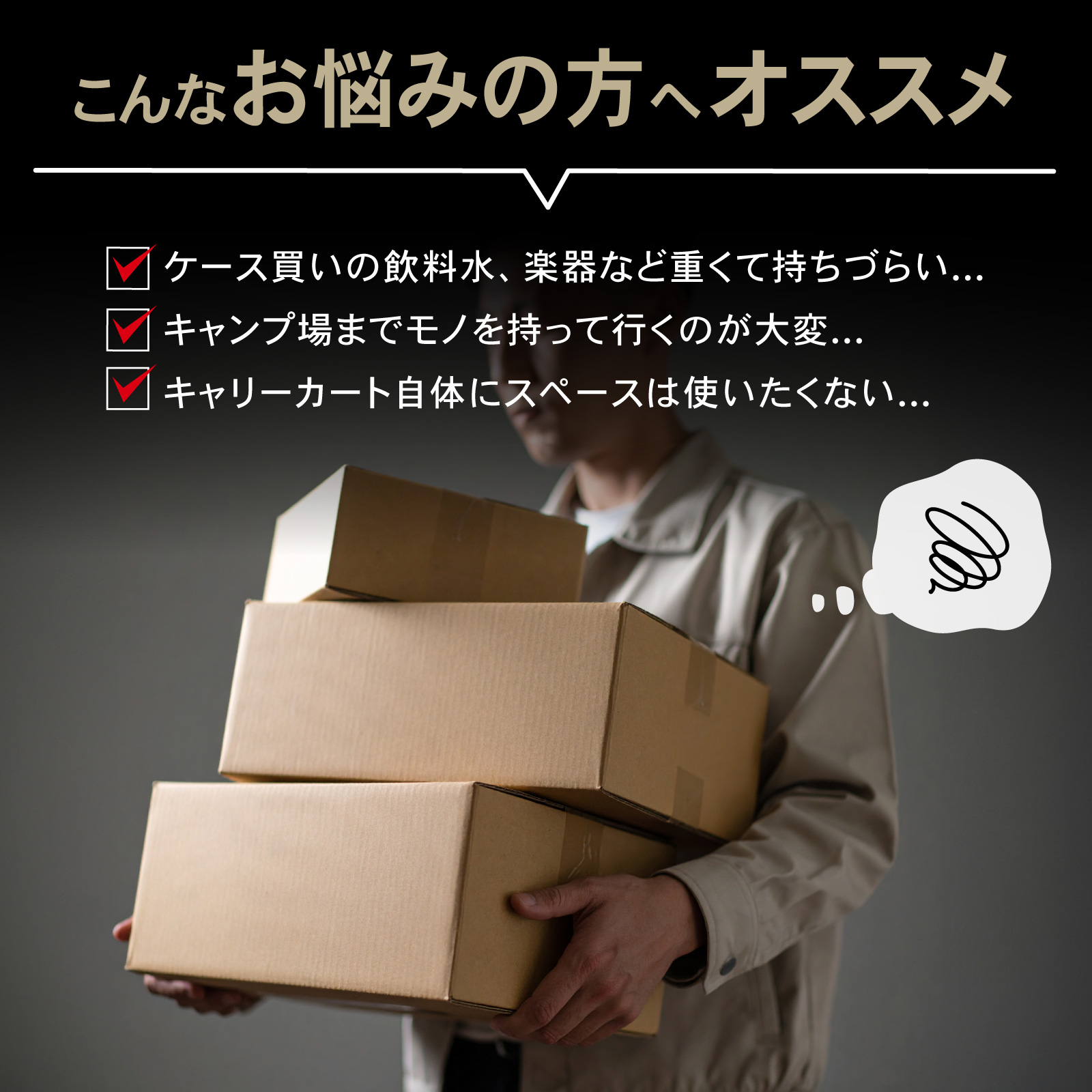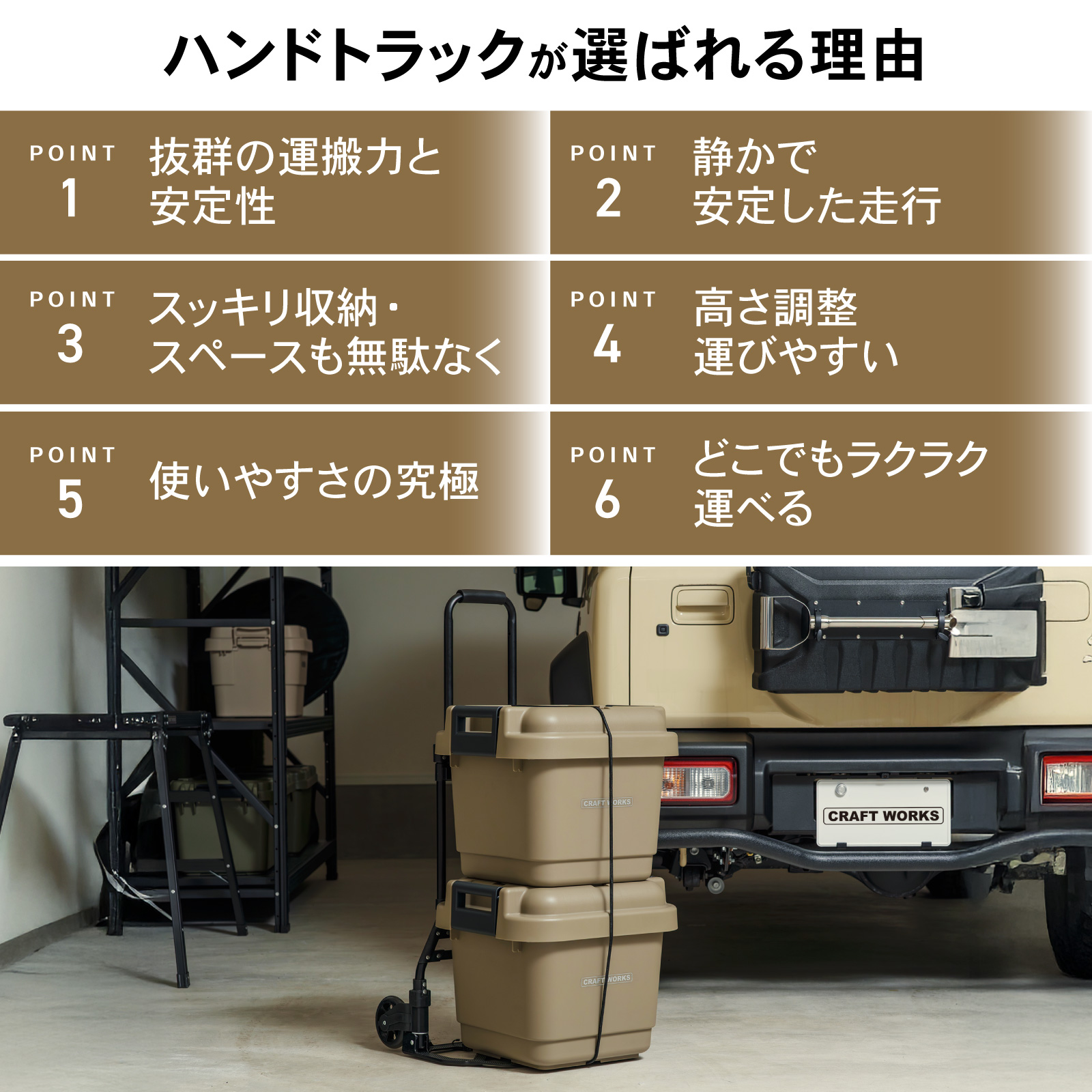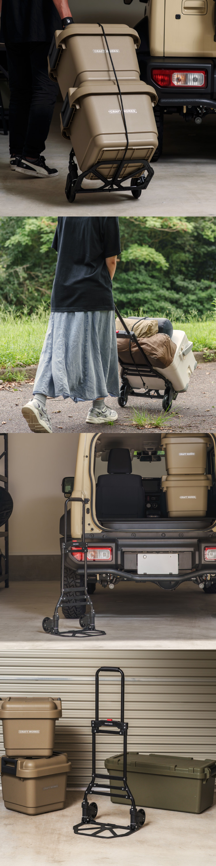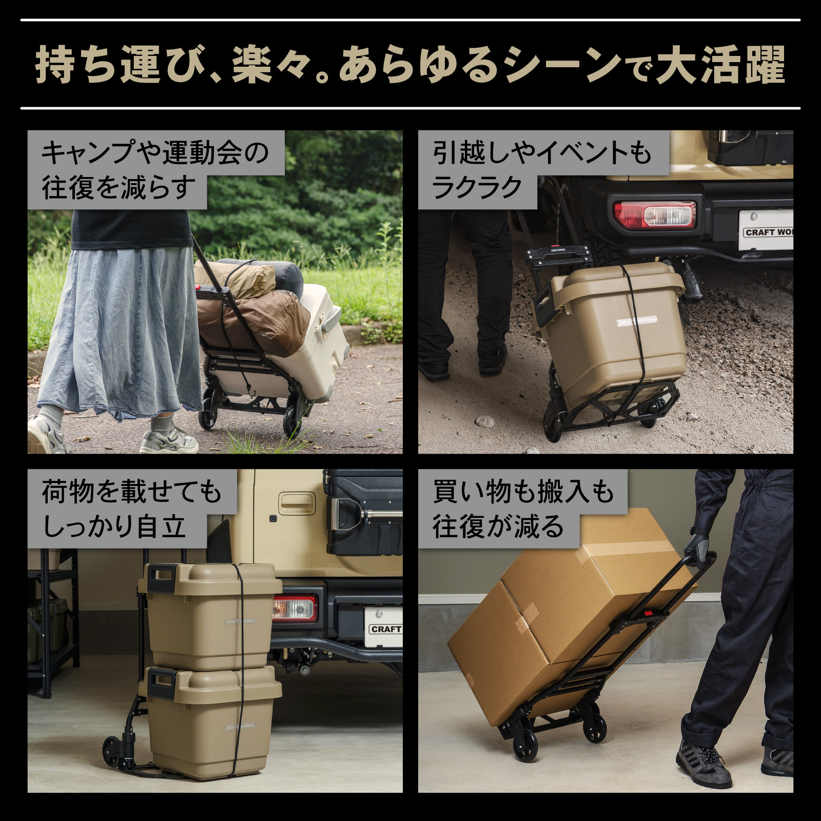 | 商品紹介 | POINT.1 「耐荷重最大80kg」 耐荷重を適切に設定することで、強度を保ちながら無駄を排除。 最適な運搬力を提供します。 POINT.2 「フックロープで荷物の落下を防止」 伸縮性のあるロープで荷物の大きさ問わずしっかり固定が可能です。 POINT.3 「静かで安定した走行」 タイヤには衝撃を吸収するTPR素材を採用。 硬さと柔軟性のバランスで、快適な運搬を実現します。 POINT.4 「わずか5cmのフラット収納」 使わない時も場所を取らない、ユーザー目線の設計です。 POINT.5 「高さ調整 運びやすい」 進化した使いやすさ 手に取れば実感 男女・体格・荷物に合わせて最適な高さ POINT.6 「使いやすさの究極」 ・荷台部分には凹凸滑り止め加工・濡れてもサビないのステンレス素材を採用・クッション性のあるグリップで重い荷物でもラクラク運搬 POINT.7 「どこでもラクラク運べる」 ・軽量設計で女性でも無理なく持ち運べます。 |