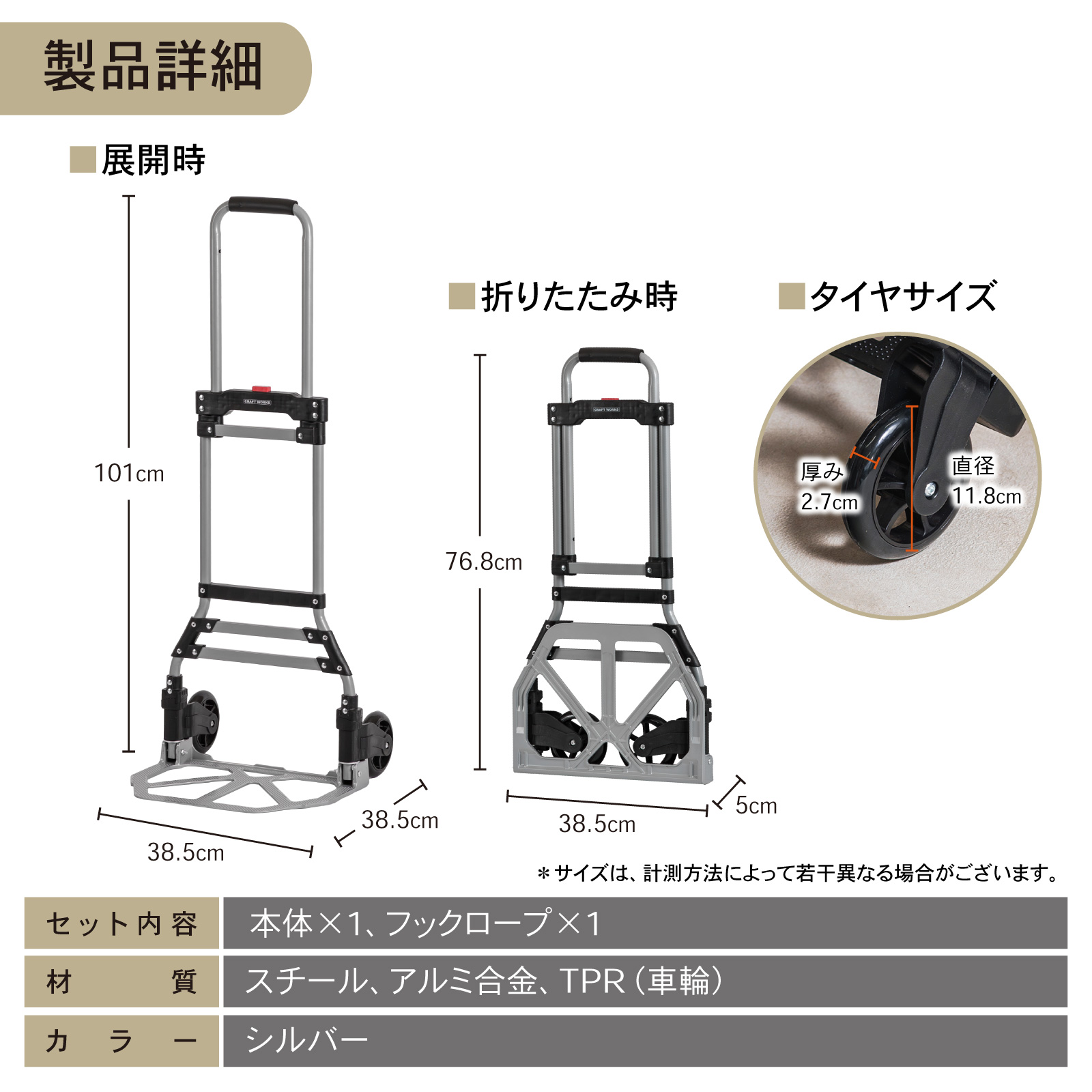 | 商品詳細 | [製品詳細] ・材質 スチール、アルミ合金、TPR(車輪) ・サイズ 【展開時のサイズ】 縦101cm横38.5cm縦38.5cm 【縮小時のサイズ】 高さ76.8cm. 横38.5cm 縦5cm タイヤサイズ 厚み2.7cm. 直径11.8cm 重量:3.2kg 総耐荷重:80kg 注意)サイズ・重量は、計測方法によって若干異なる場合がございます。 注意)こちらは「M」サイズです。 ◎Lサイズはこちら |