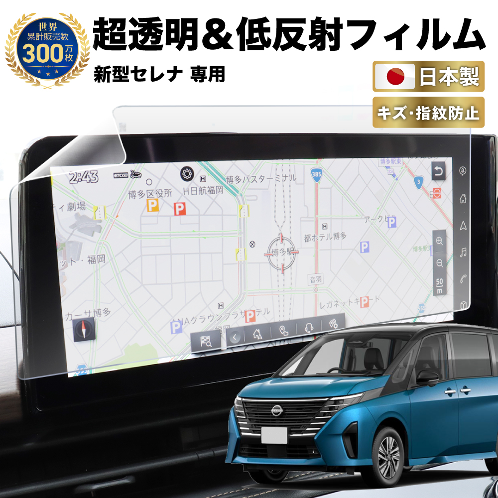 | セット内容 | ・硬度3H カーナビフィルム 超透明&低反射 AR タイプ ・日産 新型 セレナ C28 用 1枚 ・貼付けキット ・ウェットワイプ ・クリーニングクロス ・ホコリ除去シール |