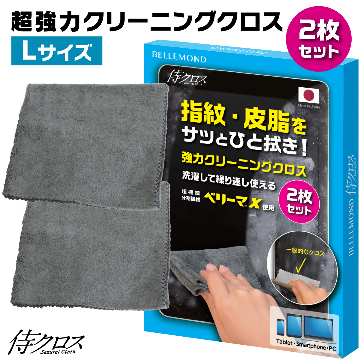クリーニングクロス 2枚セット Lサイズ 大判 33cm 30cm 日本製 超極細繊維 ベリーマ(R)X 使用 マイクロファイバー 超強力 クリーナー [侍クロス ] 洗濯可能 iPhone iPad MacBook ノートPC 有機el テレビ モニター カーナビ ピアノブラック 用