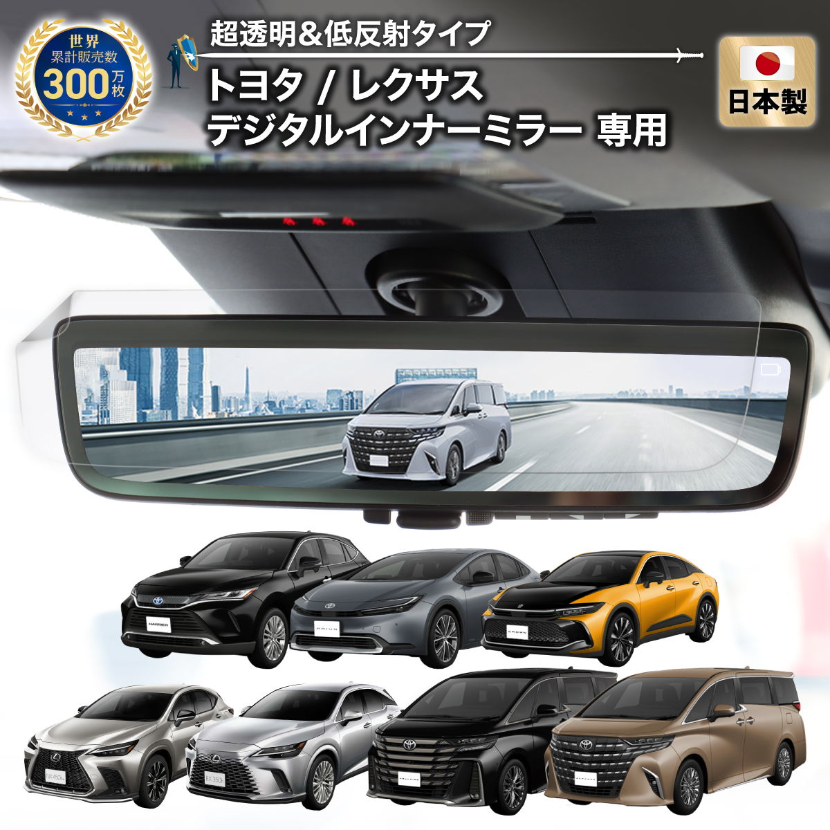 | 商品の特徴 | ・ベルモンドの「貼るだけ簡単キレイ カーナビ守る君 <超透明&低反射 AR タイプ>」の特徴 ・適合確認済み ・完璧にフィットする形状 ・ の日本製フィルムで ・低反射で映像が見やすくなる ・超透明で白っぽくならない ・指紋/汚れを軽減するフッ素加工 ・硬度3Hでひっかき傷を防止 ・気泡防止/貼り直し可能 ・簡単貼り付けキット付き ・適合確認済み のベルモンドが実際の端末で検証した専用設計になります。 ・ な日本製 「品質の良いフィルムがいい」 ベルモンドの トヨタ / レクサス デジタルインナーミラー カーナビフィルム 超透明&低反射 AR タイプは、日本国内製造の フィルムです。 品質にこだわって製造しているので貼りやすさ・耐久性に自信があります ・低反射 「映像を見やすくしたい」 ベルモンドの トヨタ / レクサス デジタルインナーミラー カーナビフィルム 超透明&低反射 AR タイプは、低反射 加工により日光の反射や映り込みを軽減します。 「太陽光で映像が見にくい」「夜間は後続車のライトが反射してまぶしい」そんな 面に関するお悩みを解決します。 「鏡面ミラーモード」でも問題なく使用できます。 ・超透明 「くっきりした映像のままがいい」 ベルモンドの トヨタ / レクサス デジタルインナーミラー カーナビフィルム 超透明&低反射 AR タイプは、透過率96%の超透明フィルムなので、映像のキレイさは損いません。 反射防止フィルムを貼ると白っぽくなって嫌だ と感じている方はぜひお試しください。 ・指紋/汚れを軽減するフッ素加工 「いつでもキレイなままがいい」 ベルモンドの トヨタ / レクサス デジタルインナーミラー カーナビフィルム 超透明&低反射 AR タイプは、指紋軽減加工を施しています。 もし指紋や汚れがついてしまった場合でもさっと拭き取れるので、ミラーをいつでもピカピカに保てます。 ・硬度3Hでひっかき傷を防止 「新車のキレイな状態を保ちたい」 ベルモンドの トヨタ / レクサス デジタルインナーミラー カーナビフィルム 超透明&低反射 AR タイプは、鉛筆硬度3Hの国内基準をクリアしているので、表面に傷が付くことを防止します。 傷が付く前に対策しましょう。 ・気泡防止/貼り直し可能 「キレイに貼りたい」 ベルモンドの トヨタ / レクサス デジタルインナーミラー カーナビフィルム 超透明&低反射 AR タイプは、特殊なシリコン吸着素材を採用しています。 貼り付けしやすいだけでなく、失敗しても剥がして貼り直しできますので、まずはお試しください。 ・簡単貼り付け 「ピッタリに貼りたい」 ベルモンドの トヨタ / レクサス デジタルインナーミラー カーナビフィルム 超透明&低反射 AR タイプは、3分割保護シートによって簡単に位置を合わせることができます。 付属のクリーニングキットと貼り付け用カードを使って、貼り付けも簡単キレイに |