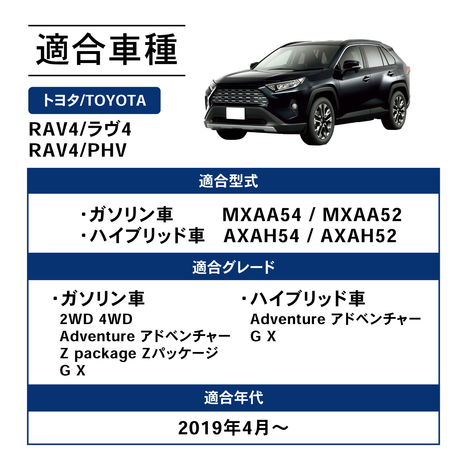 | 商品詳細 | [適合車種 ] ・TOYOTA/トヨタ RAV4/ラヴ4 [適合型式 ] ・ガソリン車 (MXAA52 MXAA54) ・ハイブリッド車 (AXAH52 AXAH54 AXAP54) [適合年代 ] ・2019年4月〜 [商品素材 ] ・ TPE [商品構成 ] ・フロアマット3枚 注意)年式・グレード・オプション等により適合しない場合が御座います。 形状をご確認いただいた上、お買い求めください |