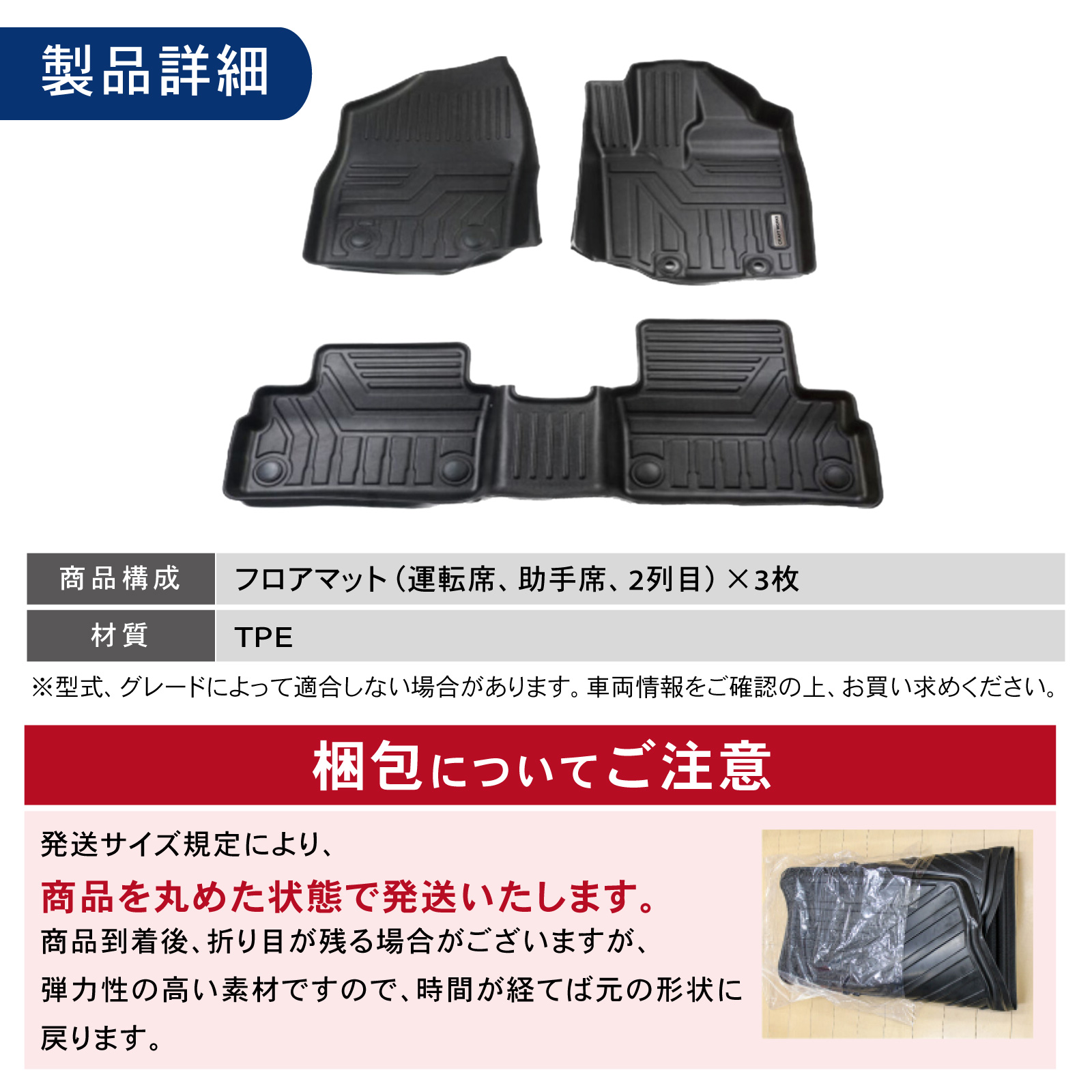 | 適合車種 | [適合車種 ] ・TOYOTA/トヨタ RAIZE/ライズ ・DAIHATU/ダイハツ ROKCY/ロッキー [適合型式 ] ・ダイハツ ロッキー : A200S / A210S 2019年11月〜 ・トヨタ ライズ : A200A / A210A 2019年11月〜 [適合年代 ] ・ダイハツ ロッキー 2019年11月〜 ・トヨタ ライズ 2019年11月〜 [商品素材 ] ・ TPE [商品構成 ] ・フロアマット 3枚 注意)年式・グレード・オプション等により適合しない場合が御座います。 形状をご確認いただいた上、お買い求めください。 |