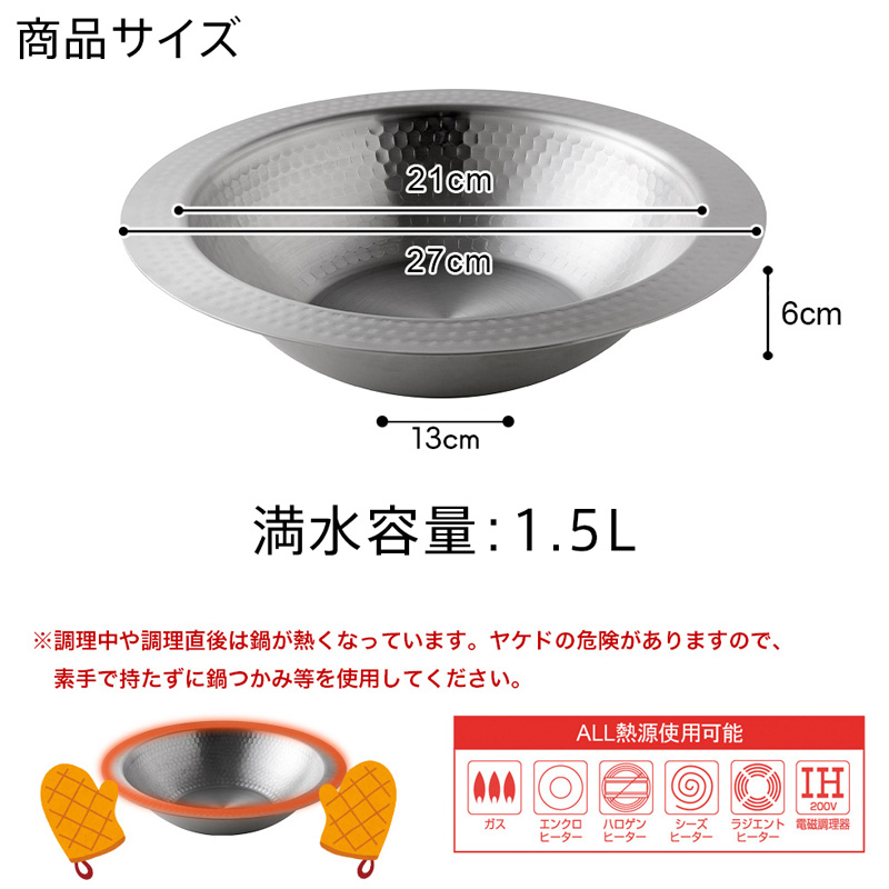| サイズ | 鍋内径:約21cm 直径:約27×高さ6cm 底の厚さ:約1.2mm 鍋底直径:約13cm |
