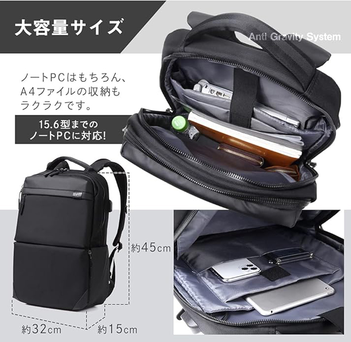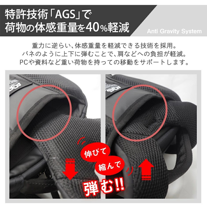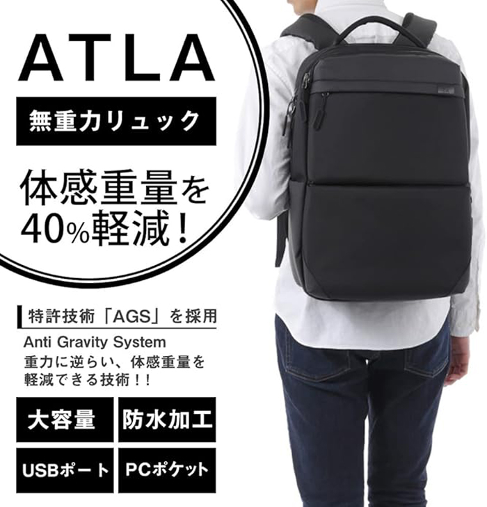 | 特徴 | ATLAは、体感重量が軽減される「AGS機能(Anti Gravity System)」を搭載した多機能リュックです。リュックの肩にかける部分がAGSにより、バネのように上下に弾むことで、肩などへの負担が軽減。パソコンや資料などといった重い荷物を持っての移動時にサポートしてくれます。 |