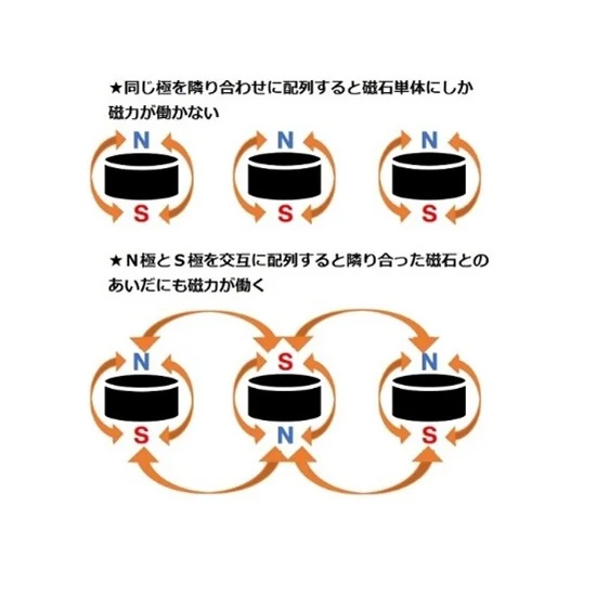 磁石はN 極とS 極を交互に配列しており、広範囲に磁力がはたらきます。