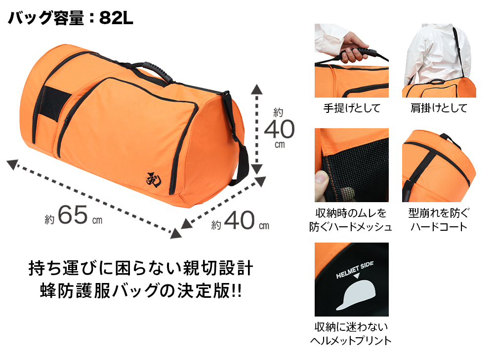 | 商品名 | ラプターIVと蜂防護服ラプター専用収納ボストンバッグのセット (V-1050+V-1700) (特許出願中・実用新案登録済・意匠登録済) |