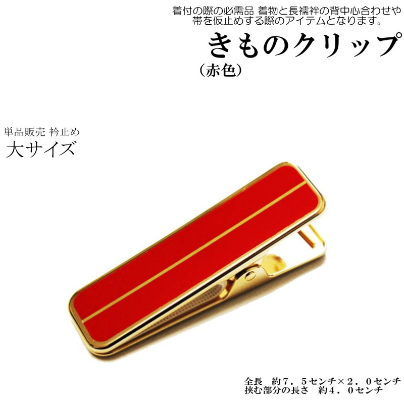 大サイズ着物クリップ1個単品販売です。着付けの際の必需品となります。背中心に着物と襦袢を仮止めする際に使用致します。その他、帯結びの際などにもご使用頂けます。素材:本体 アルミニウム 真鍮ゴム:合成ゴムサイズ:本体/長さ約7.5センチ×2.0センチ挟む部分の長さ約4.0センチ