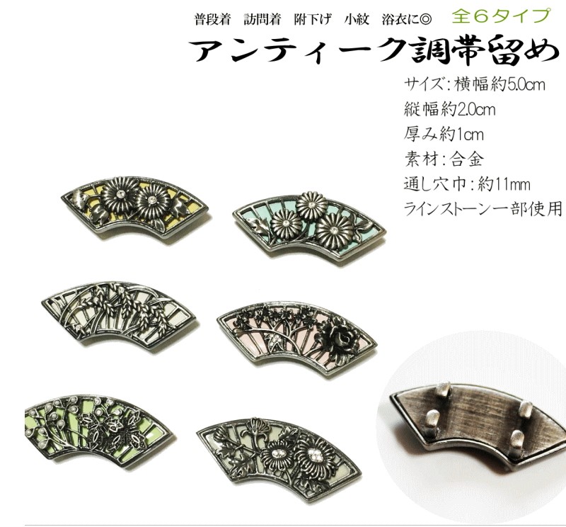 商品詳細アンティーク調帯留め サイズ:横幅約5.0cm 縦幅約2.0cm厚み約1cm 通し穴巾:約11mm 素材 合金 生産国 中国製 商品説明 アンティーク調の帯留めとなります。ラインストーンを各所に使用、落ち着いた風合いで小紋や紬などから附下げ訪問着などの正装着浴衣などのカジュアル着まで幅広くご利用頂けます。※紐の通し部分の巾は最大11ミリ程です。