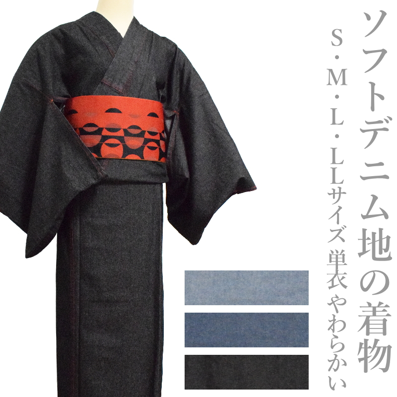 お仕立て上がり 単衣 ソフトデニム地の着物 (S ML LL各サイズ/青系/黒系/単衣着物/裏無し デニム生地) 【YP100P】
