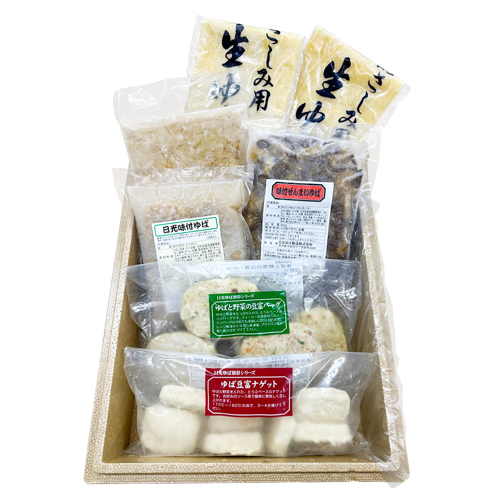 さしみゆばや味付ゆば、そしてとうふ生地にゆばを入れた簡単調理のヘルシー商品がたっぷり入った日光ゆばの人気商品の詰合せです。