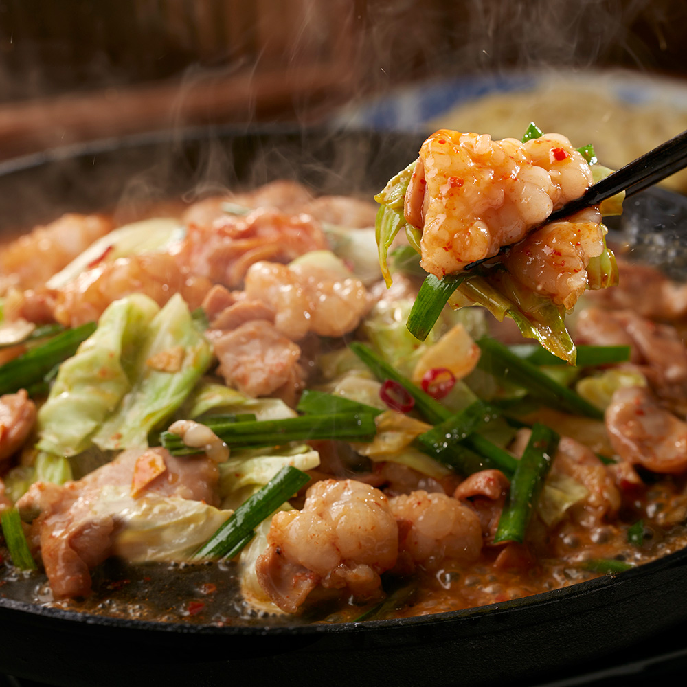 辛みそだれで味付けした国産牛小腸と、鶏はらみを熱々の鉄板で焼きあげる「もつ鉄板」のセットです。ビールやお酒のあてとしてはもちろん、ご飯との相性もピッタリ。残ったタレとちゃんぽん麺を絡めた〆まで絶品です!