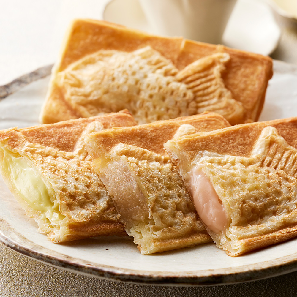 希少な備中白小豆あんを使用した、あっさりと上品な白あん。十清水白桃と蒜山ジャージー牛乳で作られた上質な香り漂う、白桃カスタードクリーム。マスカット・オブ・アレキサンドリアにチーズを加えて、爽やかな酸味を感じられるレアチーズケーキ風のマスカットチーズ。岡山が誇る素材を使用した3種類をセットにしました。手作業で27層に折り込まれた生地は贅沢なほどにバターの香り高く、それでいて甘さ控えめです。