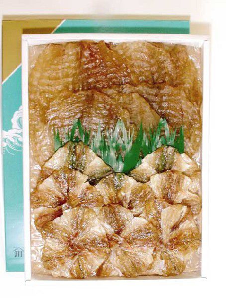 のどぐろ桜干し:のどぐろ(赤むつ)、砂糖、醤油、還元水飴、醗酵調味料、ワイン/調味料(アミノ酸等)、酸味料、甘味料(ステビア、甘草)、ソルビトール、酵素、ピロリン酸Na、ビタミンB1、(原材料の一部に、大豆・小麦を含む)
