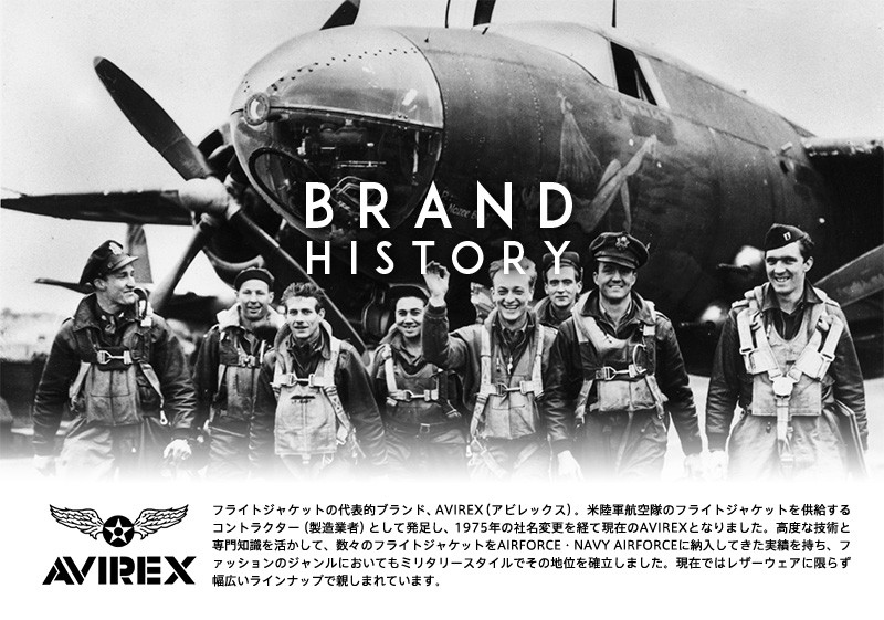 | ブランド | 1975年、アメリカ空軍のコントラクターとして、発足したアビレックス。高度な技術と専門知識を活かして、数々のフライトジャケットをAIRFORCE・NAVY AIRFORCEに納入。ファッションのジャンルにおいてミリタリーのジャンルでその地位を確立し現在ではレザーウェアに限らず、幅広いラインナップで親しまれています。その他のAVIREX アビレックスはこちら | ||||||||||||||||||||||||