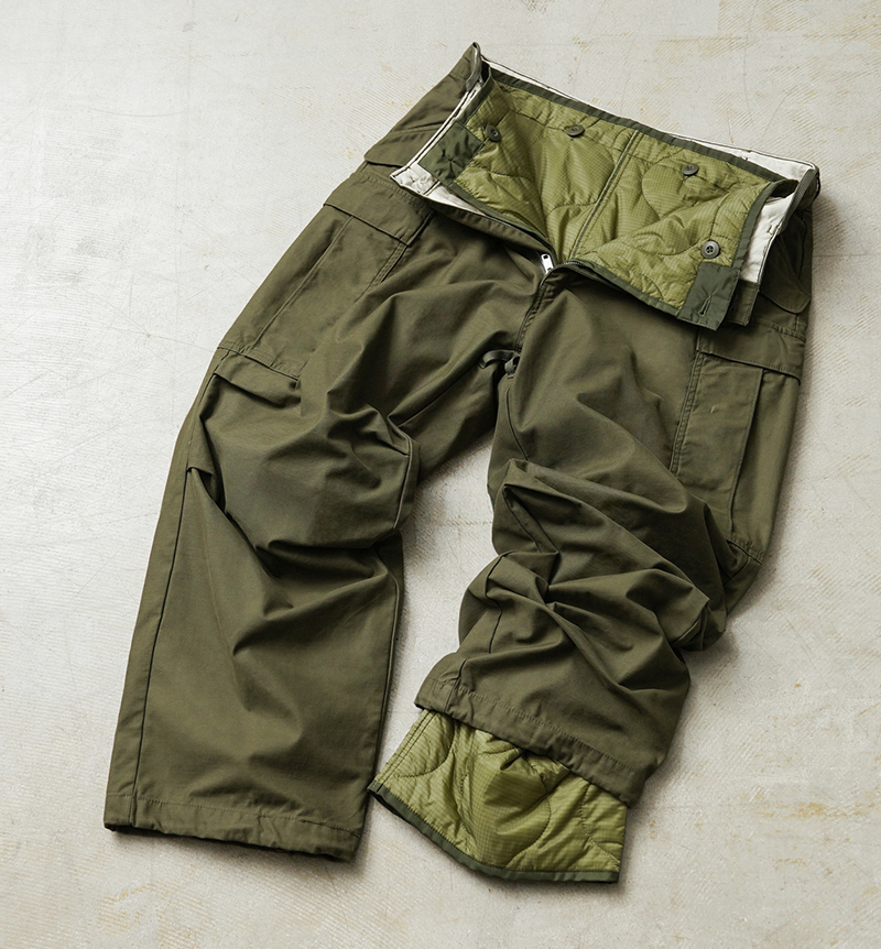 年間を通じて着用期間も長いM-65カーゴパンツを、真冬の極寒時にも履く事を可能にするパンツライナーとなります。