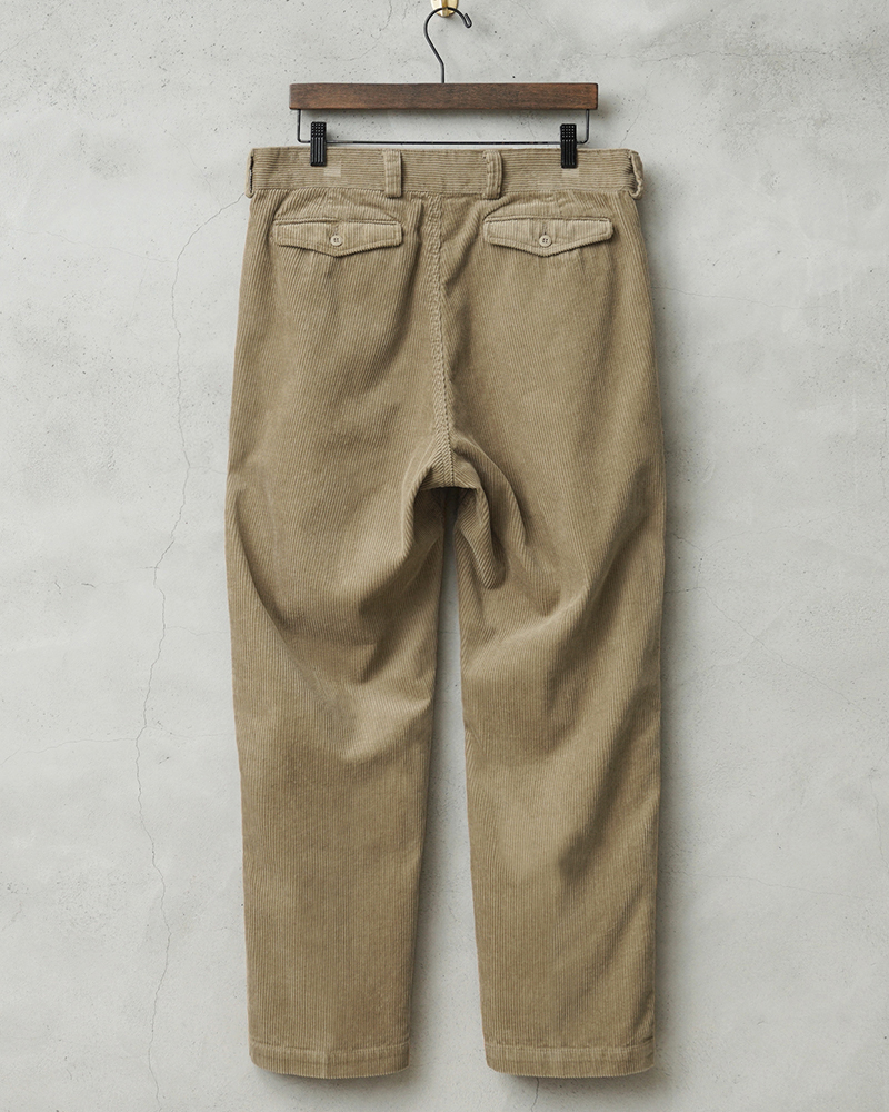 | 商品説明 | WAIPER.incフランス軍 1950〜60年代 M-52 ツータック コーデュロイ トラウザー テーパードシルエット のご紹介です。 品番:WP128 ご好評いただいておりますWP69 フランス軍 M-52 チノトラウザーデザインを、実は17世紀のフランスを起源とし、現在はカジュアルスタイルの定番としておなじみのコーデュロイ生地で仕上げた一本が登場です。こちらのWP128はWP69でご好評いただいている、ツータックデザインとウエストから裾にかけてテーパードしたシルエットをそのまま踏襲。スニーカー、ブーツ、ローファーなど様々なシューズと相性がよく、ロールアップスタイルも作りやすいアイテムです。 縦に走る畝と独特の毛羽立ちから感じられるやわらかい質感が魅力のコーデュロイ生地。日本では秋冬向けと思われがちなコーデュロイ生地ですが、実はアメリカ、特に西海岸地域では夏に履くための生地として作られています。コーデュロイはカットパイルと呼ばれるパイル地です。非常に肌あたりがよく、日焼けした肌などにも優しいため、サーフィンなどが盛んな西海岸では暑い季節にも重宝されているそうです。 畝の太さによって太コール、中コール、細コール、極太のものは鬼コールといった呼び名がありますが、こちらの一本には定番として使いやすい中コール生地を使用。履いた時に軽快さも感じられる、ほど良いウェイトで通年ご愛用いただける一本になっています。特徴である畝の凹凸に空気を蓄えることで断熱効果を発揮し暖かさもキープしてくれるので、もちろん冬場にも持ってこいですが、さらっとした内側の肌触りに吸湿性も持ち合わせているため、どの季節にも最適な印象です。 サイドポケット、フラップ付きのバックポケットを配した、コーデの定番として活躍するシンプルな4ポケデザイン。ツータックデザインに股下にはガゼット付きで動きやすさがあるのもポイントです。 コットンツイルのWP69と同じく履きこむことで現れる経年変化も楽しみなところ。冬物のイメージが強いコーデュロイですが、オールシーズン活躍してくれる魅力的なテキスタイルとして再認識していただける一本ではないかと思います。 | |||||||||||||||||||||||||||||||||||||||||||||||||