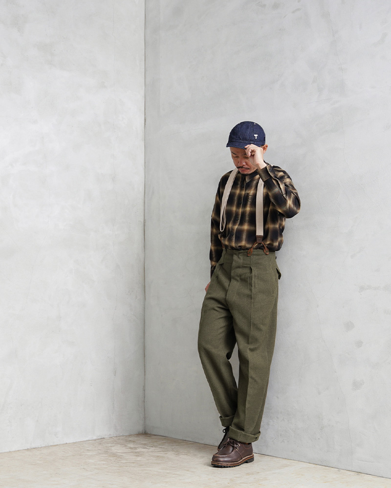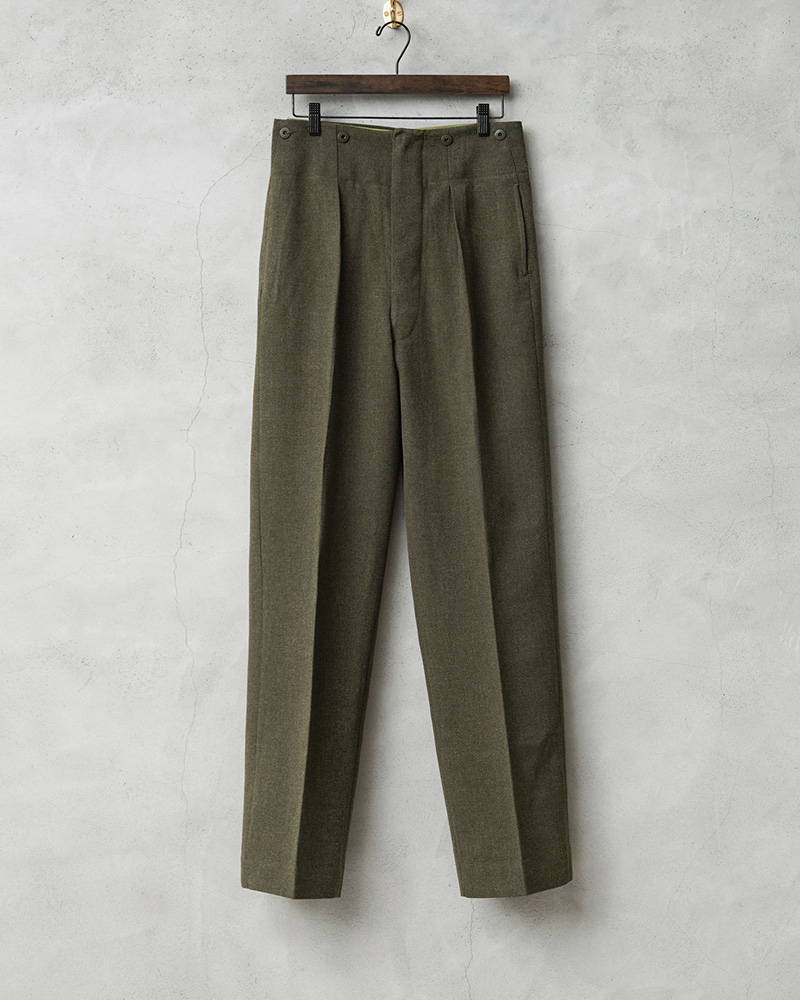 | 商品説明 | リジェクト 訳あり品 実物 新品 デッドストック カナダ軍 BATTLE DRESS(バトルドレス)ウール トラウザーズ CADET MODELのご紹介です。 1950年代を中心に使用されていたカナダ軍のヴィンテージトラウザーズが入荷しました!肉厚なウール素材が使用された上質なトラウザーズで、カナダ軍の士官候補生が使用していた歴史を感じさせる1本です。 BATTLE DRESS(バトルドレス)は第2次世界大戦の開戦直前にイギリス陸軍に導入され、1960年代まで着用されていました。イギリス軍より得られたデザインから様々な国でも採用され、各国独自のバリエーションのバトルドレスが導入されていました。 フロントはボタンフライ仕様で、サスペンダーボタンなど全体にドーナツ型のメタルボタンが使用された贅沢な仕様です。ウエストにはサスペンダーボタンが付属していますのでサスペンダーで吊り下げてトラディショナルなスタイルをお楽しみいただけます。 肉厚で紡毛された綾織りのウール素材が使用されており、両サイドのスラッシュポケット、バックポケットはボタン留めのフラップポケットが2箇所付属しています。適度にワイドで綺麗なストレートシルエットで、裾のストラップとボタンで裾のシルエットを調節することもできる仕様になっています。 多少ブラウンが混ざったようなオリーブが年代物の雰囲気を感じさせる品の良い色目で、ウール素材のパンツは保温性に優れており、抗菌・防臭効果もある素材です。センタークリースを備えることで縦にまっすぐ伸びたラインが強調され、上品さが際立ちます。 こちらは長期保管時に生じたホツレや破れなど不具合のある商品を選別しております。多少のリペアを施していただいてからの着用、もしくはリメイク資材としてもおすすめです。ファーストクオリティの品質を強くお求めの方は念の為ご購入をお控え願いますようお願い致します。 | ||||||||||||||||||||||||||||||||||||||||||||||||||||||||||||||||||||||||||||||||||||||||||||||||||||||