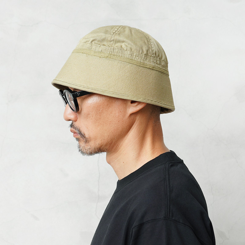 | 商品説明 | 実物 新品 デッドストック 米軍 セーラーハット BEIGE染め のご紹介です。 通称ゴブハットと呼ばれる水兵帽として広く認知され、アメリカ海軍で伝統的に着用されるセーラーハットのBEIGE染めが登場。 “ゴブ”とはセーラーの俗語で本来のツバを折り替えしたルックスをいいますが、ツバをおろして目深にかぶったスタイルは現代のファッションコーデにもマッチします。 6パネルクラウンに、強度を高めるためにツバの部分には非常に細かいステッチがはいった堅牢な造り。型崩れの心配もなく、スタイルを維持することが可能です。 元々水兵帽らしい特徴的なホワイトカラーだったものを、丁寧に染職人の手によってBEIGE染め。よりファッションの一部として取り入れやすくなっています。 テニスハットのような丸いクラウンに、下に向かって伸びたツバが目深にかぶったときミステリアスな雰囲気。シンプルなデザインと絶妙な色合いのハットは、コーディネートのアクセントとしてこだわりを感じさせるアイテムです。 | |||||||||||