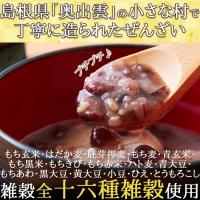 | 原材料名 | 餅米(島根県産)、砂糖(甜菜)、小豆(島根県産)、十六種雑穀ミックス(もち玄米、はだか麦、胚芽押麦、もち麦、青玄米、もち黒米、もちきび、もち赤米、ハト麦、青大豆、もちあわ、黒大豆、黄大豆、小豆、ひえ、とうもろこし)、食塩 |