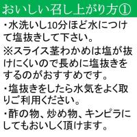 | 利用方法 | ・水洗いし10分ほど水につけて塩抜きして下さい。 ※スライス茎わかめは塩が抜けにくいので長めに塩抜きをするのがおすすめです。 ・塩抜きをしたら水気をよく取りご利用ください。 ・酢の物、炒め物、キンピラにしてもおいしく頂けます。 |