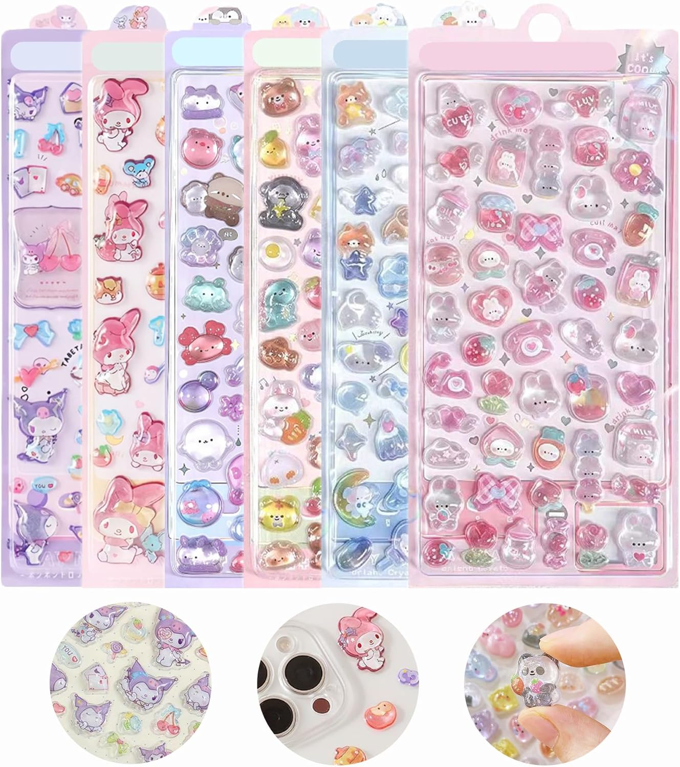 【製品の外観と視覚効果】この6枚組の可愛らしくふわふわした立体3Dステッカーは、精巧なデザインが施されており、見る角度によってキラキラと輝き、異なる視覚効果を呈します。手帳やスマホケースのデコレーション、アルバム作成に最適です。