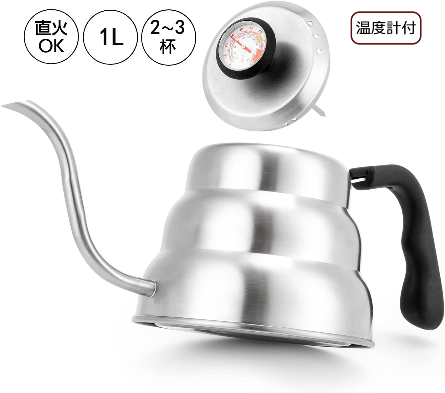 ドリップポット 1L コーヒーケトル ステンレス製 温度計付き 細口 コーヒー やかん ガス火対応 直火対応 オール熱源対応 珈琲 ギフト アウトドア
