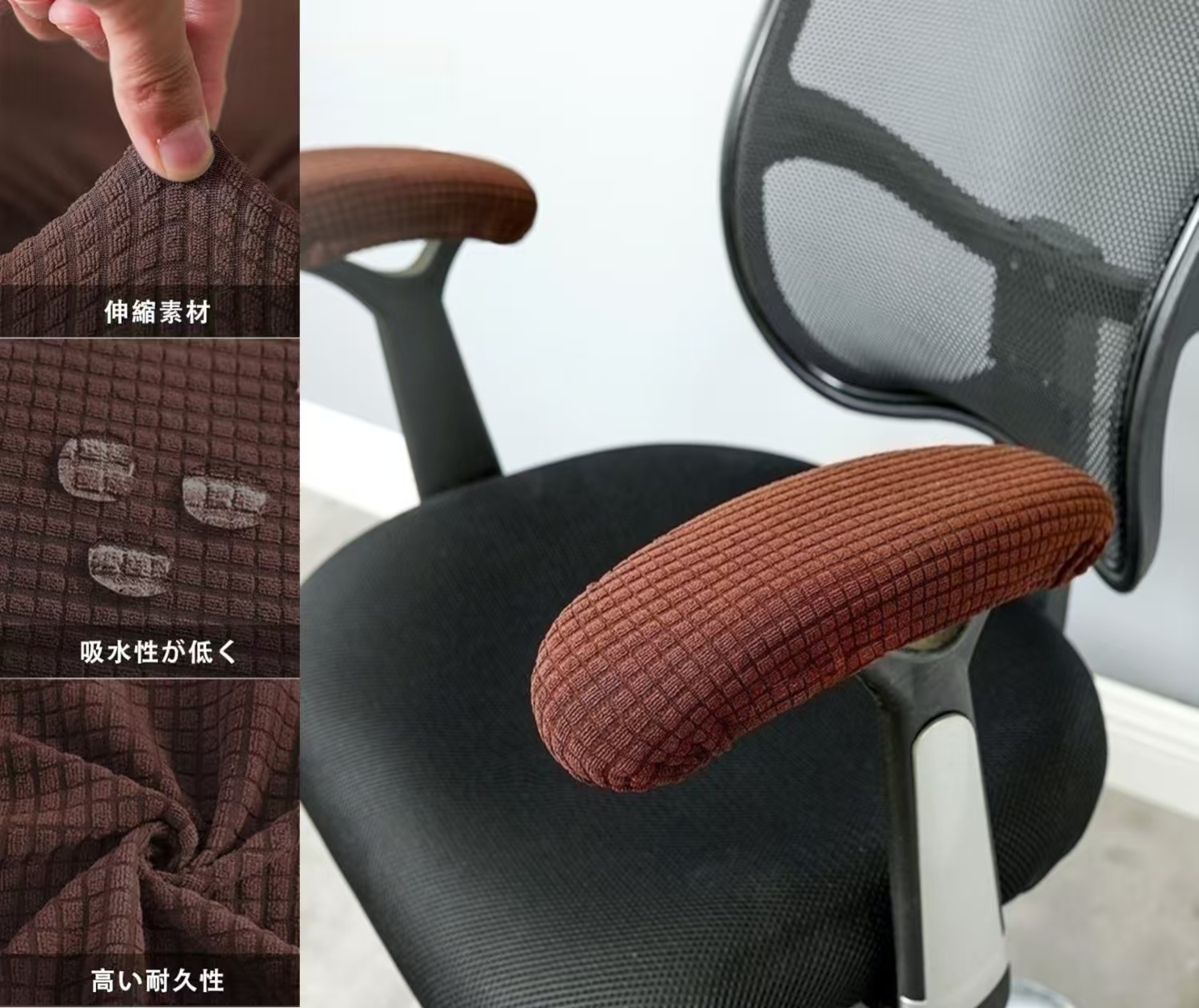オフィスチェア等のひじ掛けに: ひじかけ椅子のアームレスト部分を包み込む柔らかい布製のアームレスト用カバーです。様々なタイプのひじおきに対応するフリーサイズ仕様で、長さが25cmから50cm程度の肘掛けにフィットします。大事な家具の保護と座り心地の快適性を向上する役割の他にも、破れたひじ置きを隠して修復する用途にも最適です