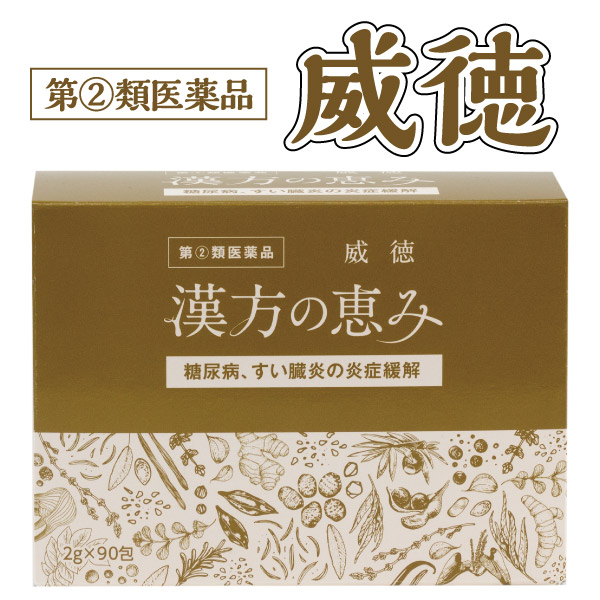 商品説明文 | 威徳 は、10種の生薬末を配合した 顆粒タイプの漢方薬 で、 糖尿病 、 すい臓炎の炎症緩解 など 漢方医学 で言う「消渇」という “喉の渇きと多食にも関わらず痩せる”状態に用いられる漢方薬です。 |