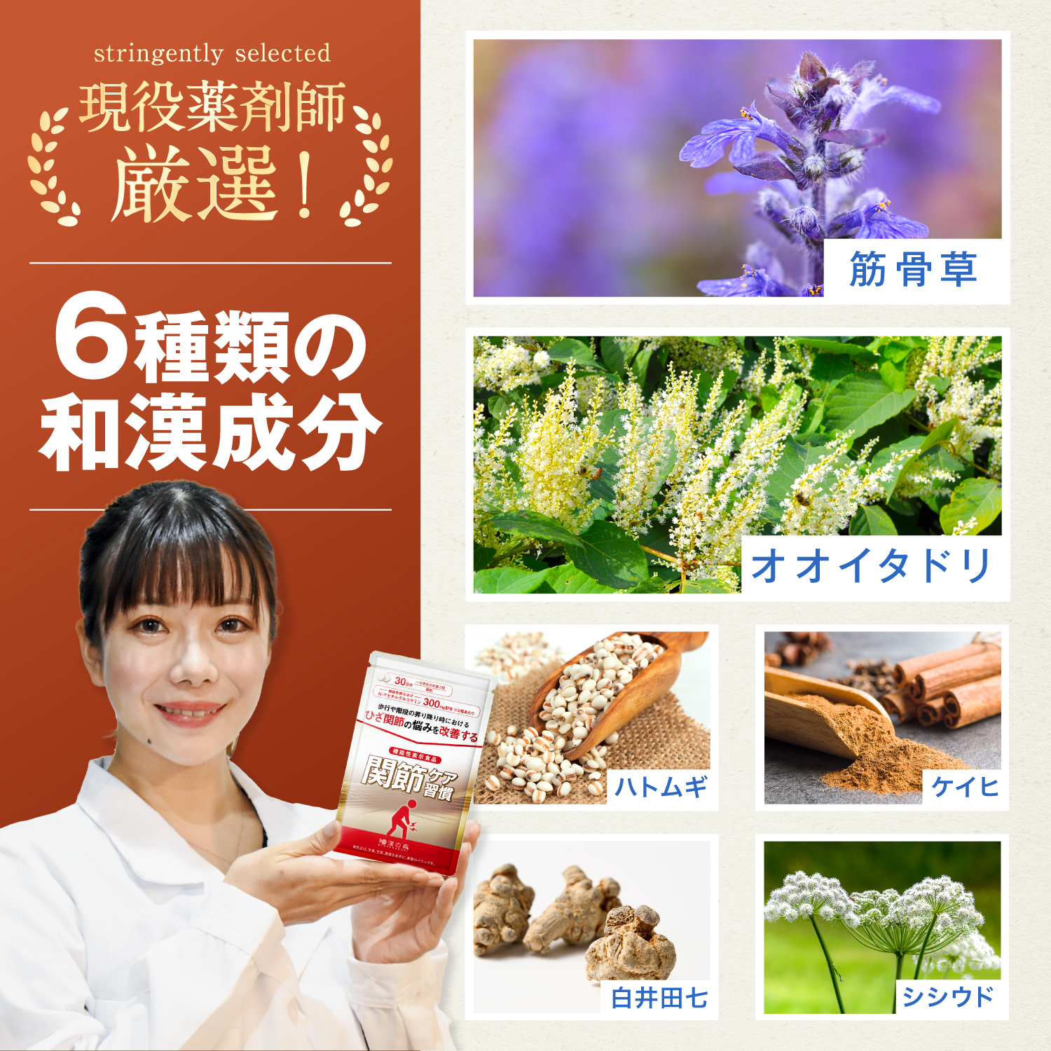 N-アセチルグルコサミン 筋骨草 エキス末 ハトムギ 末 メチルスルフォニルメタン( MSM ) ケイヒ末 シシウドエキス末 オオイタドリエキス末 プロテアグリカン含有サケ鼻軟骨抽出物( プロテオグリカン ) 豚軟骨エキス( II型コラーゲン 25%含有) 田七人参末 / ソルビトール 結晶セルロース HPC ステアリン酸カルシウム 微粒二酸化ケイ素 セラック ヒアルロン酸 カルナウバロウ