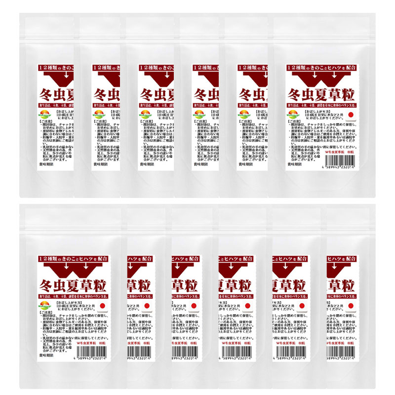 冬虫夏草菌糸体粉末(国内製造)、マルトース、冬虫夏草子実体末、霊芝粉末、チャーガ粉末、アガリクス粉末、鹿角霊芝粉末、マイタケ粉末、メシマコブ粉末、山伏茸粉末、ハナビラタケ粉末、タモギタケ粉末、シイタケ粉末、シロキクラゲ粉末、エリンギ粉末、ヒハツ粉末/結晶セルロース、ステアリン酸カルシウム、微粒二酸化ケイ素
