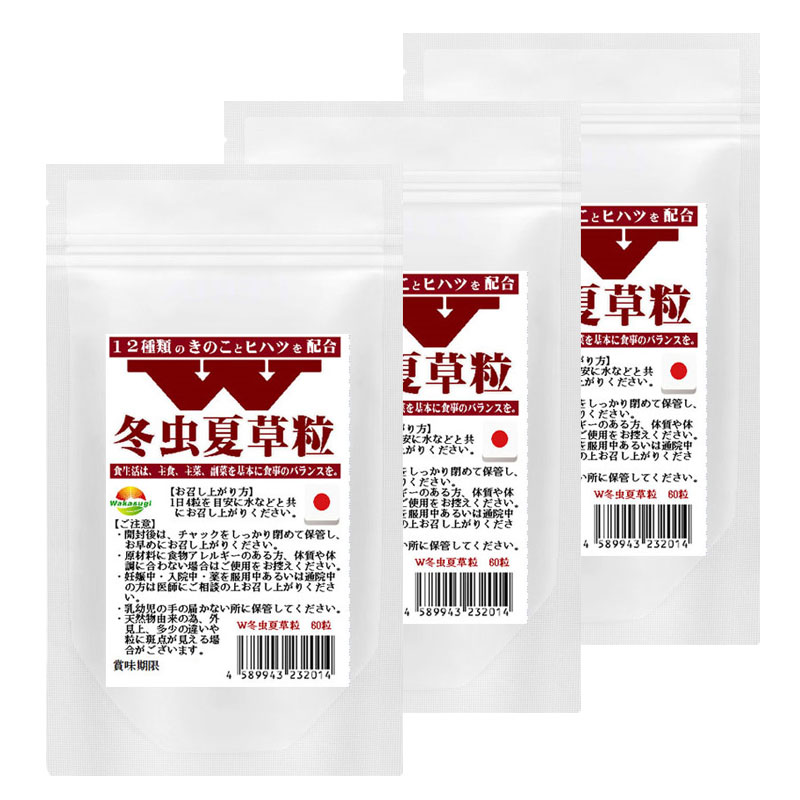冬虫夏草菌糸体粉末(国内製造)、マルトース、冬虫夏草子実体末、霊芝粉末、チャーガ粉末、アガリクス粉末、鹿角霊芝粉末、マイタケ粉末、メシマコブ粉末、山伏茸粉末、ハナビラタケ粉末、タモギタケ粉末、シイタケ粉末、シロキクラゲ粉末、エリンギ粉末、ヒハツ粉末/結晶セルロース、ステアリン酸カルシウム、微粒二酸化ケイ素