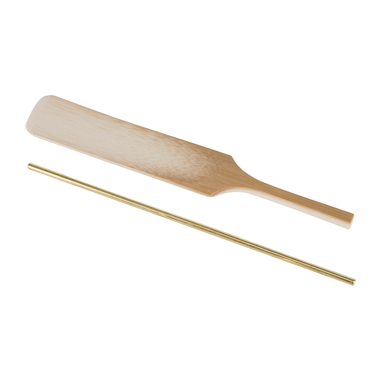 煙草盆で使用する火入の灰を整えるための「竹製灰押」と「真鍮製筋棒」のセットです。竹の灰押は軽く手に馴染み、灰面を柔らかく美しく均すことができます。真鍮の筋棒は、整えた灰に端正な筋を引き、茶席に清らかな趣を添えます。素材の持つ質感が静かな存在感を放ち、日々の茶席にさりげない品格をもたらす道具です。