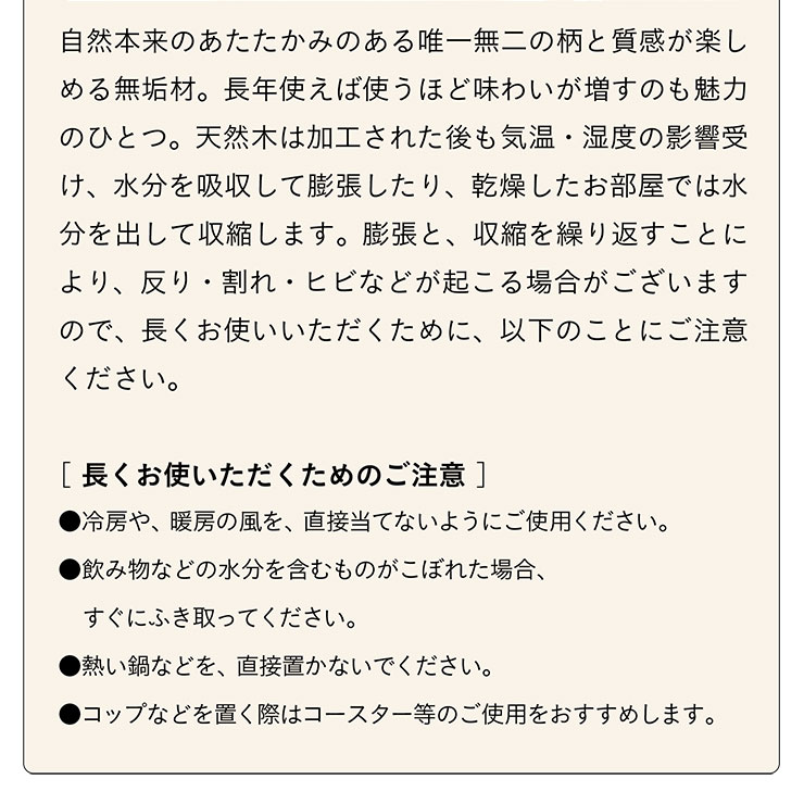 ※天然木の為木の表情や風合いには個体差がございます。節や木の濃淡などを理由とした返品・交換は対象外となりますので予めご了承ください。