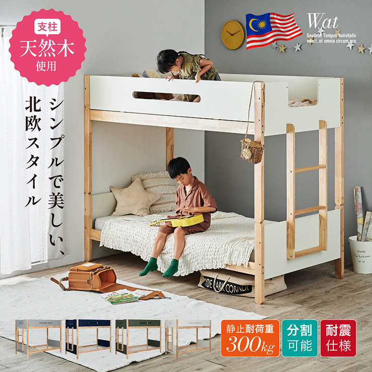 二段ベッド 大人用 子供 分割可能 木製 天然木 耐震仕様 おしゃれ Wat(ワット) 4色対応 収納付き 高さ調整 シングル はしご付き コンパクト シンプル 子供部屋