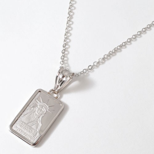 | | spec | | 素材 | ●インゴット(プラチナ9995 2g)枠(プラチナ900)、チェーン(真ちゅうロジウムメッキ仕上げ) | | チェーン | ●小豆チェーン ●長さ約44cm ●留具は引輪式 | | トップの大きさ | 枠込の大きさ約19.5mm×12mm(バチカン込約29mm) ●枠込の厚さ約1mm | | 総重量 | ●約3.0g(トップ部分) | | デザイン | 表:光沢に艶消しの自由の女神 裏:光沢に文字