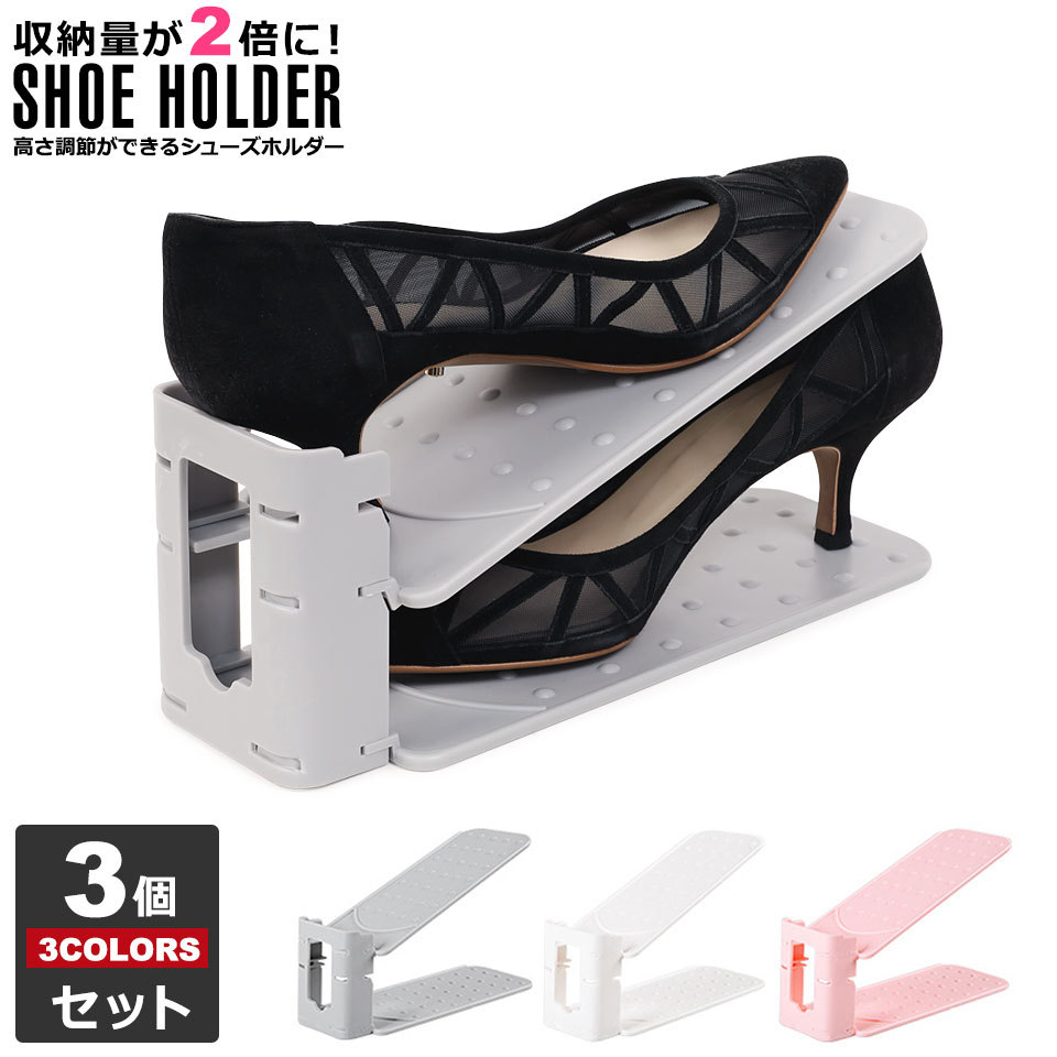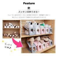 シューズ1足分のスペースに2足収納できるから、収納量が2倍になるシューズホルダー。高さ調節が可能なので、ぺたんこ靴やスニーカーはもちろん、ヒールの高いパンプスやハイカットシューズも収納できるシューズホルダーです。
