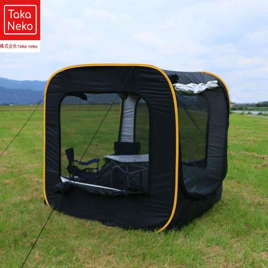 【3面開放構造】高さ2mのキュービック構造が特徴。デッドスペースが少ない構造のため、コンパクトな見た目に反して広々とした空間を利用者に提供する。大きな3面の窓にはメッシュスクリーンが付属していて、虫の進入を防ぎつつ心地よい風や美しい景色を楽しめる。