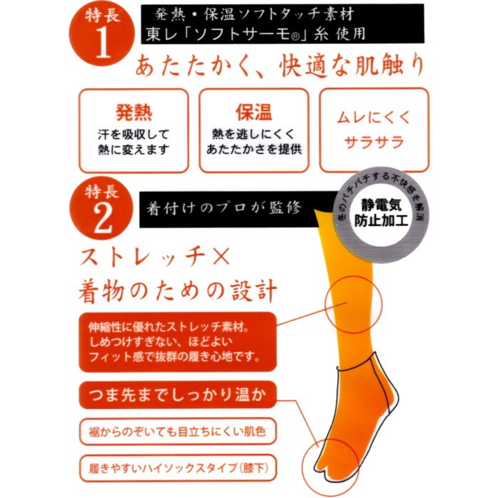 東レの「ソフトサーモ」糸を使用した、寒い冬にピッタリ!あたたかい和装足袋インナーのひざ下 ロングタイプ特長