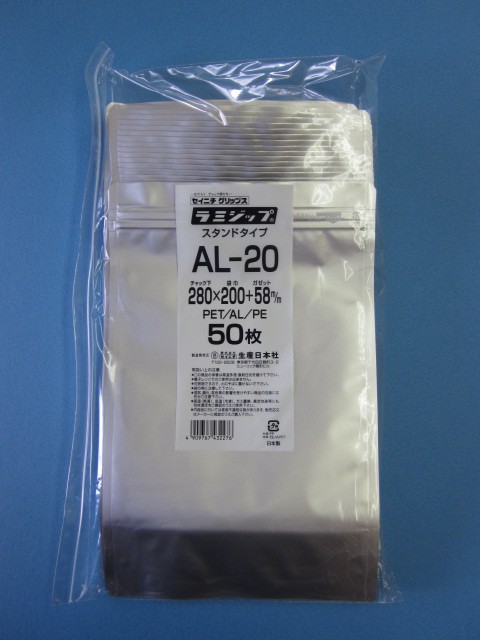 アルミ袋 ラミジップ AL-20 50枚袋入 スタンドパック 自立袋 チャック付 ガスバリア 防湿 遮光 保存