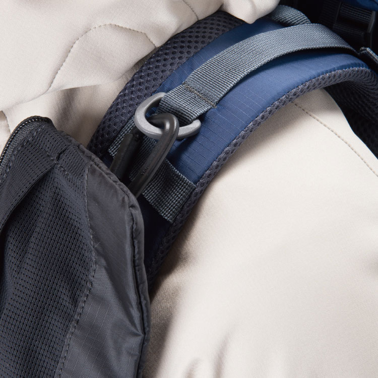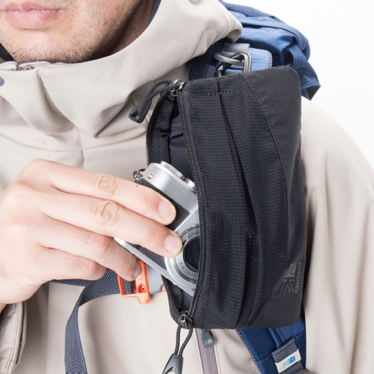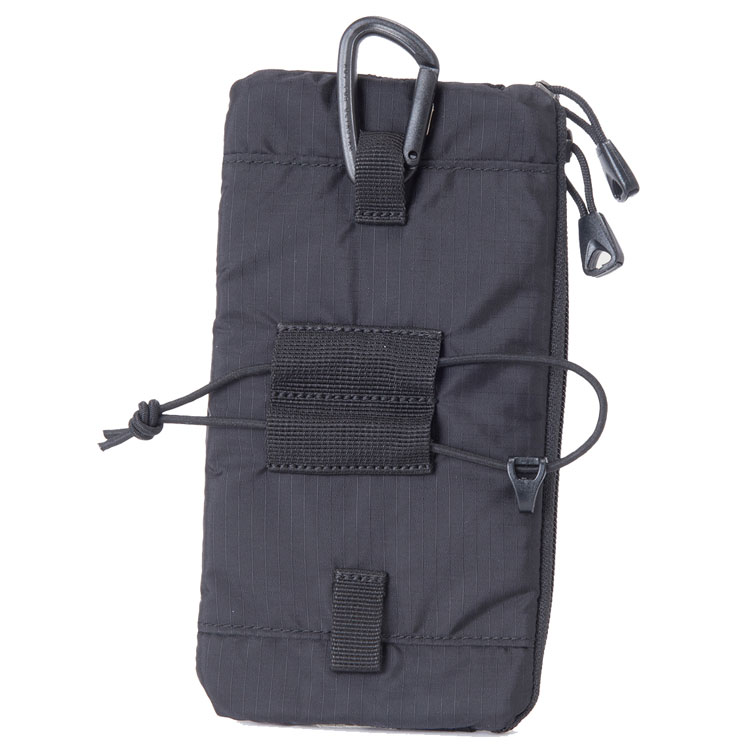 プラスチックカラビナとイラスチックコードを使用し、ショルダーハーネスに固定できる小型のポーチ。スマートフォンをはじめ、ガジェットの携行に便利 |