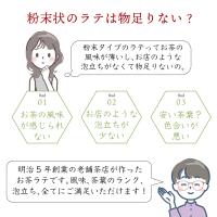 | 栄養成分表示 | 【抹茶らて】(1杯15g当たり) エネルギー 66.4kcal、たんぱく質 0.96g、脂質 1.95g、炭水化物 11.5g、食塩相当量0.08g 【ほうじ茶らて】(1杯15g当たり) エネルギー 68.1kcal、たんぱく質 0.7g、脂質 1.98g、炭水化物 11.8g、食塩相当量0.08g 【チャイティーらて】(1杯15g当たり) エネルギー 64.5kcal、たんぱく質 0.9g、脂質 1.8g、炭水化物 11.4g、食塩相当量0.08g |