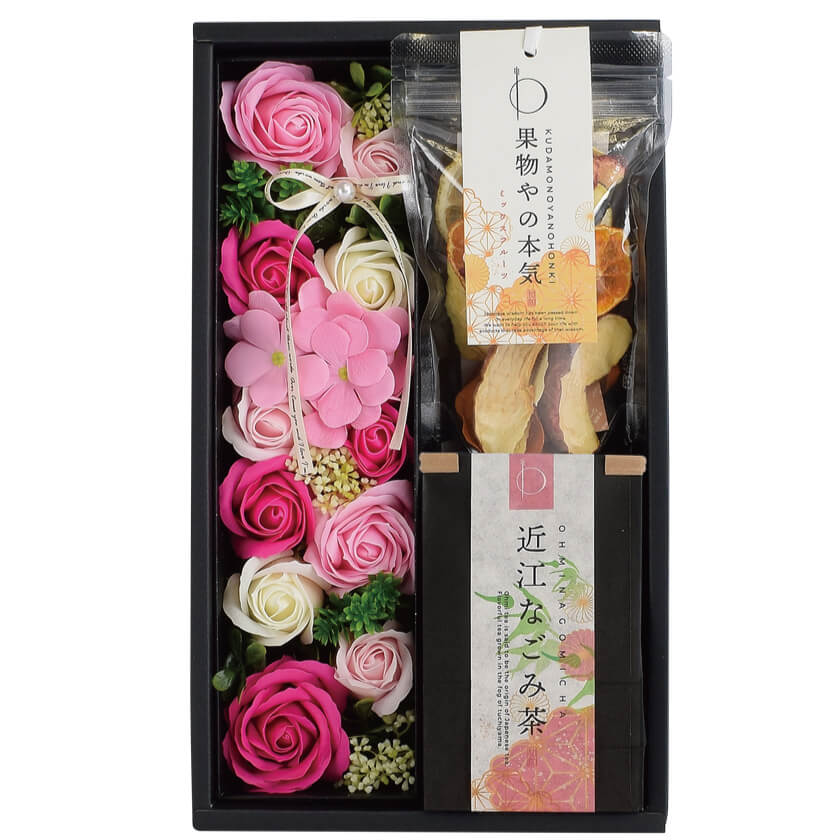 | 内容量 | 【果物やの本気】 55g 【近江なごみ茶 和紅茶】 4g×8個入(ティーバッグ) 【ソープフラワー】ボックスサイズ:32.2x9.2x8cm |