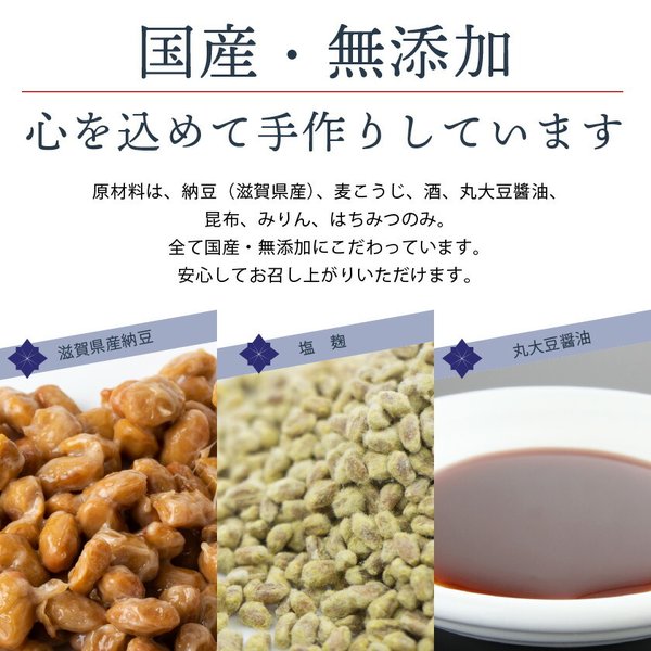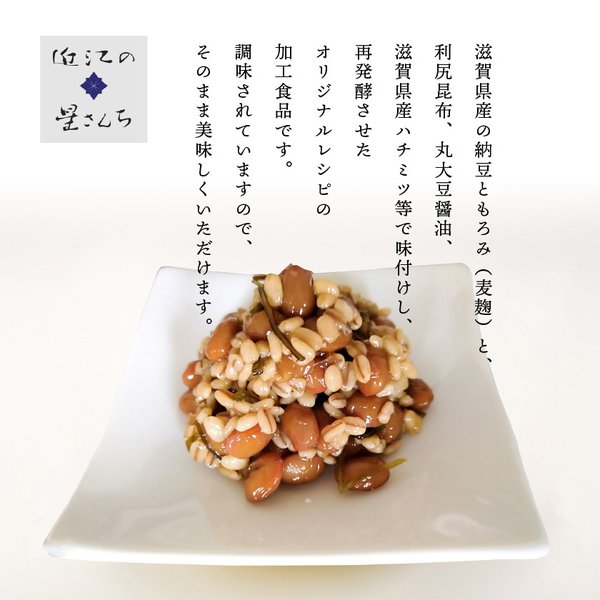 ■もろみ納豆は、滋賀県産の納豆ともろみ(麦こうじ)、利尻昆布、丸大豆醤油、滋賀県産はちみつ等で味付けし、再発酵させた加工食品です。