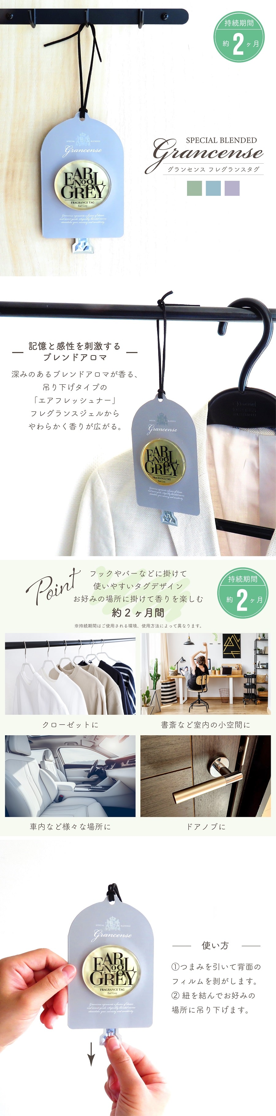 芳香期間の目安は約2ヶ月となっており、他のタグやサシェ類より長く香りが続くのも魅力的。
